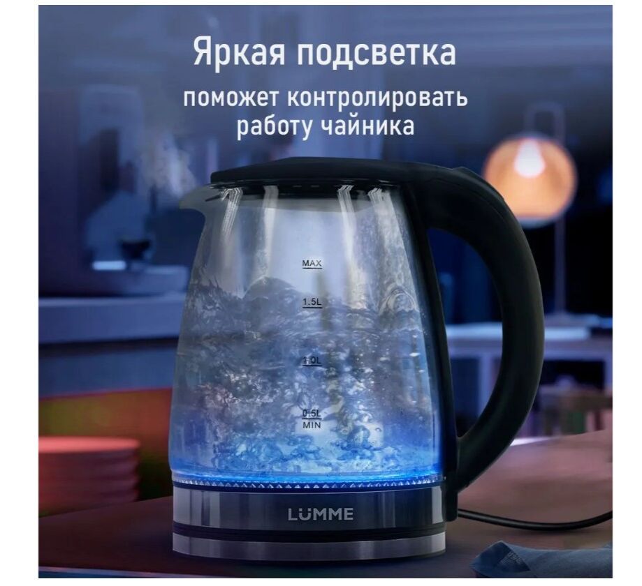 Благодаря внутренней светодиодной подсветке чайник особенно хорошо смотрится в работе и дарит отличное настроение красотой бликов закипающей воды.