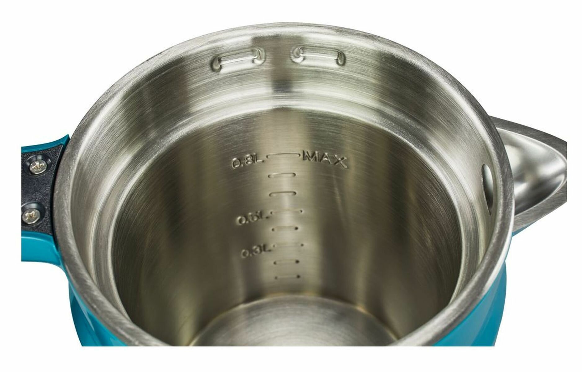 Данный чайник позволит вскипятить воду без привязки к розетке. Внешний корпус чайника сделан из пластика, который сохраняет поверхность теплой, а воду дольше горячей. Цельнометаллическая колба объемом 800 мл предотвращает образование протечек.