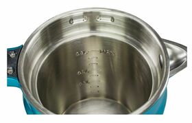 Внутри колбы выбита мерная шкала. Крышка оснащена съемным металлическим фильтром и клапаном, который предотвращает разбрызгивание воды или проливание при транспортировке.