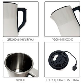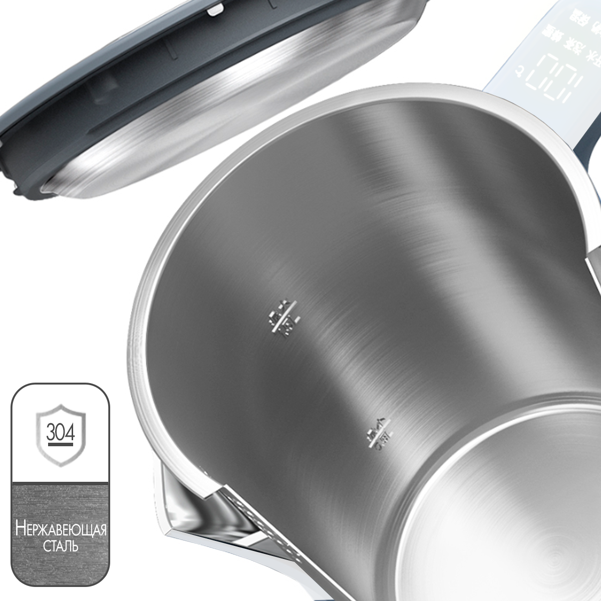 Центр управления температуры – британский термостат STRIX – это один из самых чувствительный контроллеров температуры. Все элементы чайника выполнены из нержавеющей стали SUS304 - оптимальной для работы с водой. Использовалось только цельное литье, без запаха и легко моющееся – для максимального удобства в эксплуатации. А утолщенное дно помогает для предотвращения накипи. Внешний корпус изготовлен из безопасного, ударопрочного ABS-пластика.
