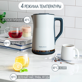 В сверхскоростном (минимальная программа нагрева составляет всего 30 секунд) чайнике Morphy Richards можно выбрать 4 уровня температуры: 45 °C / 55 °C / 85 °C / 100 °C. Когда вода в чайнике достигнет до предварительно выбранного уровня температуры, чайник автоматически выключится. Кроме того, на интеллектуальной панели управления можно выбрать 2 функции: обычное кипячение и поддержка температуры нужного уровня.
