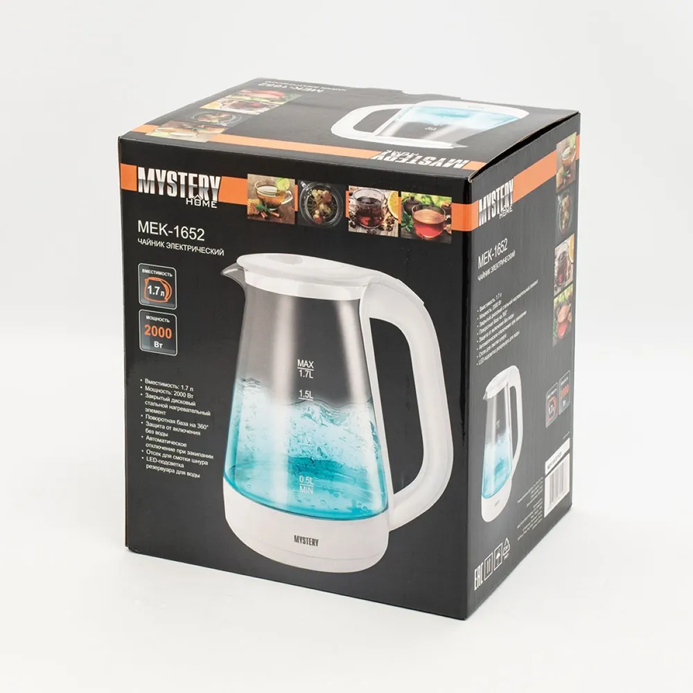 Электрический чайник Mystery MEK-1652 имеет утонченный внешний вид и сможет прекрасно вписаться в интерьер современной кухни. Приятная LED подсветка стеклянного резервуара произведет успокаивающее действие. Чайник стеклянный имеет такие функции защиты, как защита от включения без воды, а также автоматическое отключение при закипании. Объем чайника стандартный - 1,7 литра. Мощность 2000 Ватт, которые позволят уже через пару минут получить литр кипяченой воды.