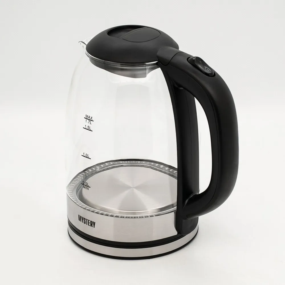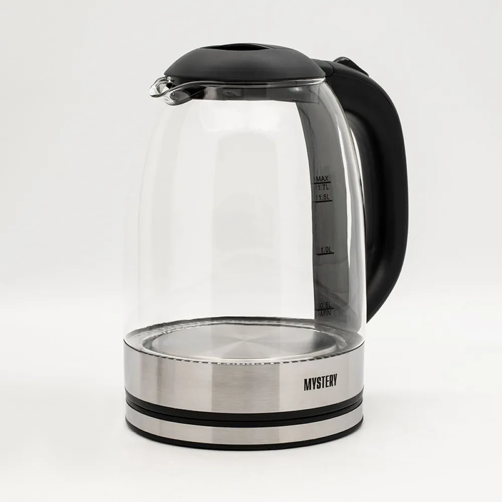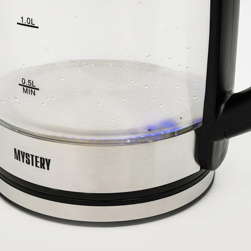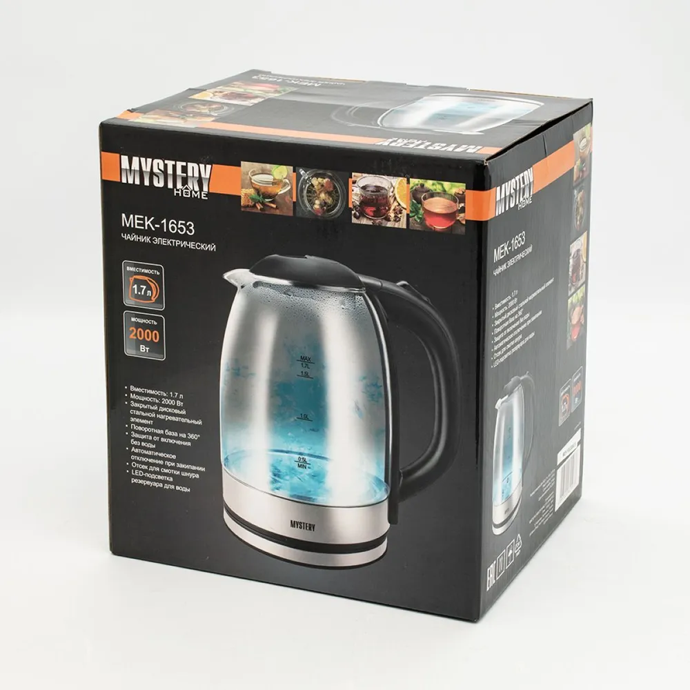 Электрический чайник Mystery MEK-1653 имеет элегантный внешний вид и сможет прекрасно вписаться в интерьер современной кухни. Корпус с элементами из нержавеющей стали дополняют богатый внешний вид. Приятная LED подсветка стеклянного резервуара произведет успокаивающее действие. Чайник стеклянный имеет такие функции защиты, как защита от включения без воды, а также автоматическое отключение при закипании. Объем чайника стандартный - 1,7 литра. Мощность 2000 Ватт, которые позволят уже через пару минут получить литр кипяченой воды.
