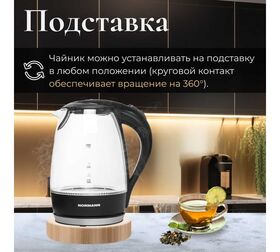 Чайник оборудован подставкой, за счет чего вращается на 360 градусов, что позволяет брать его с любой стороны.