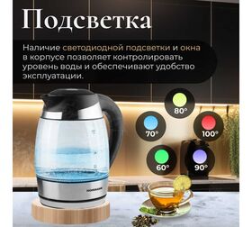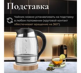Чайник оборудован подставкой, за счет чего вращается на 360 градусов, что позволяет брать его с любой стороны.