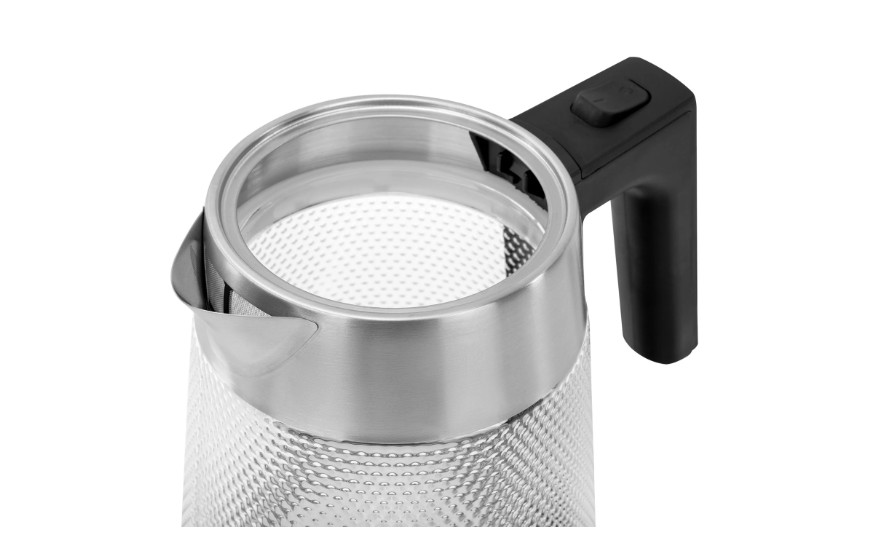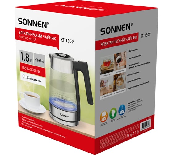 Электрический чайник SONNEN KT-1809 имеет надежный корпус из термостойкого стекла с оригинальной текстурой и прочное основание из нержавеющей стали.