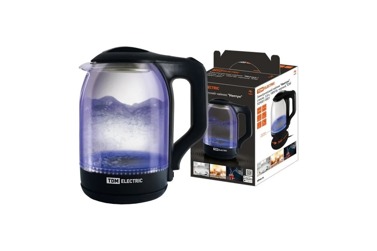 Электрический чайник TDM Нептун 1.8 л, стекло, 1800 Вт, черный SQ4001-0001 предназначен для нагрева и кипячения питьевой воды.