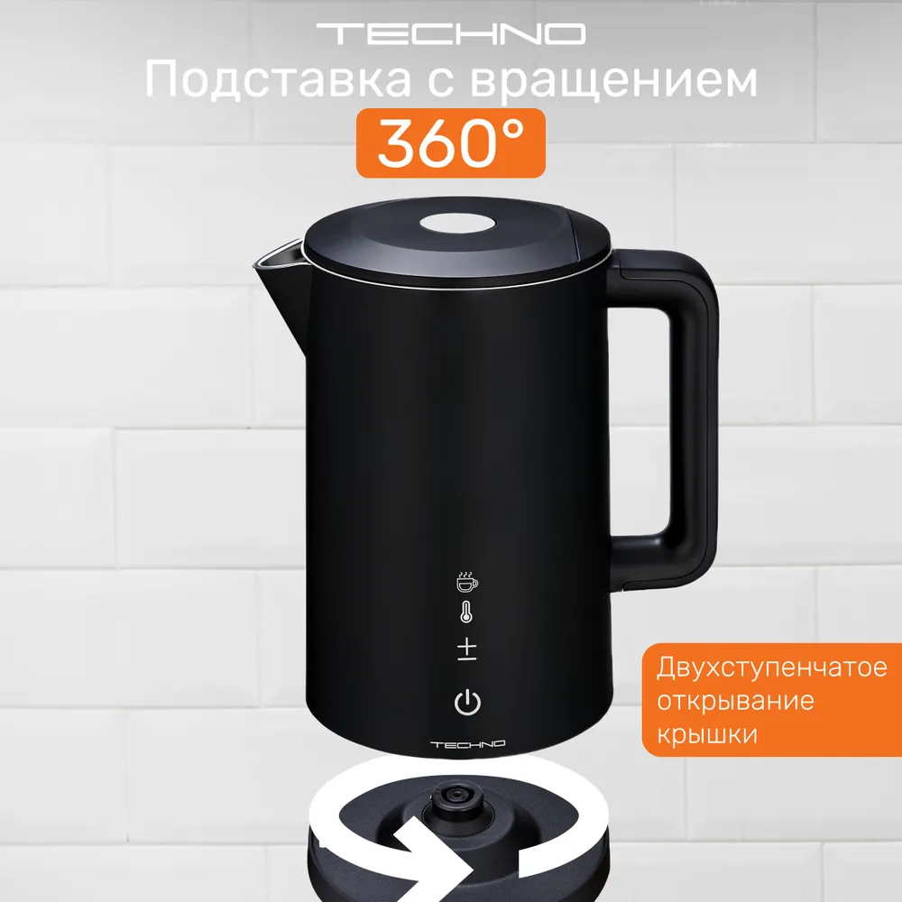 Конструкция чайника: Вращение подставки на 360°, Двухслойный корпус, Дисплей, Противокапельная система, Фильтр от накипи, Бесшумный