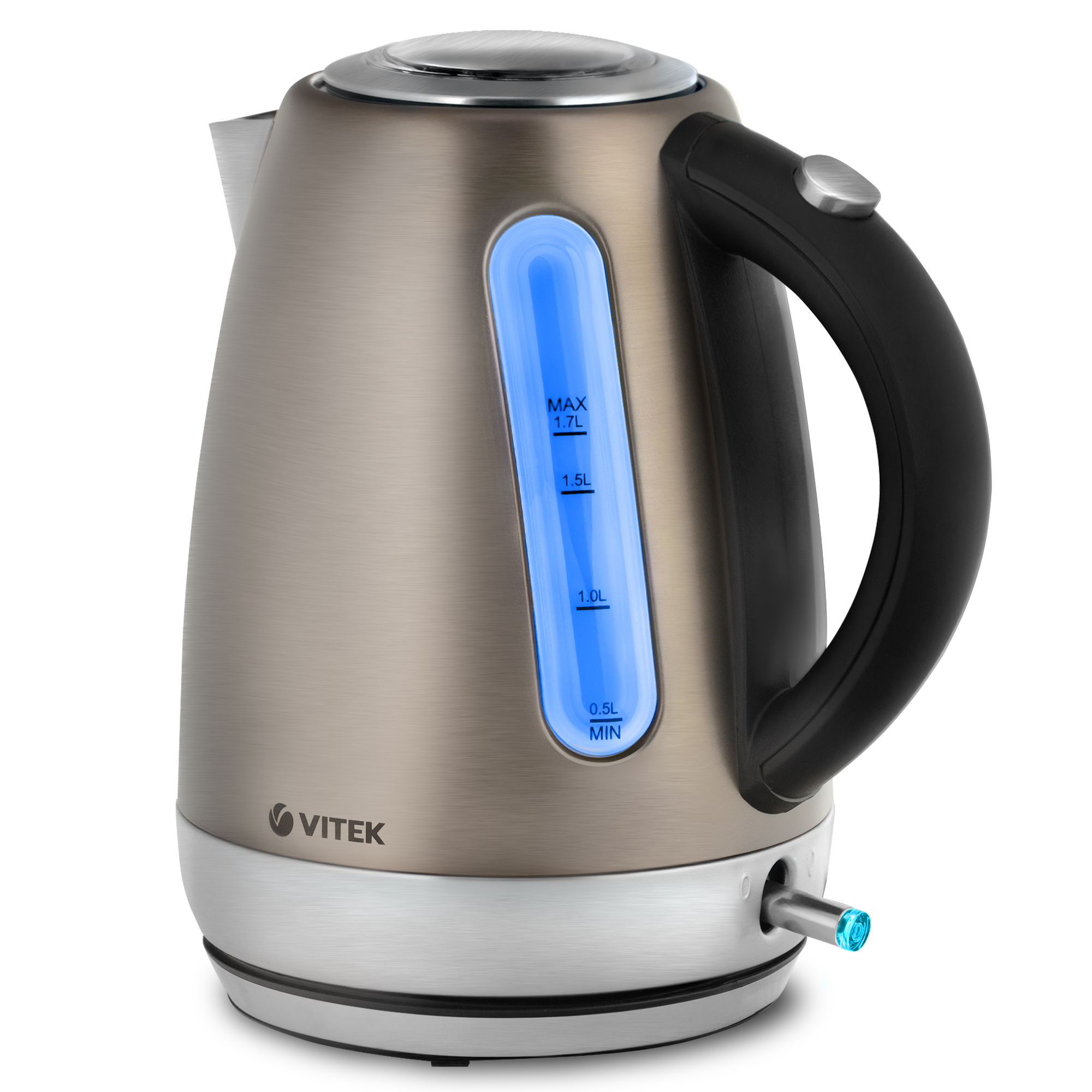 Быстро вскипятить 1,7 л воды поможет вам стильный чайник VITEK VT-7025 мощностью 2100 Вт, корпус которого изготовлен из высококачественной нержавеющей стали. Прибор оснащен сертифицированным английским контроллером STRIX, гарантирующим устройству долгий срок службы. Окошко со шкалой уровня воды имеет красивую голубую подсветку, которая гармонично сочетается с эффектным цветным покрытием корпуса под титан. Съемный фильтр, расположенный внутри носика прибора, надежно защищает напитки от накипи. Пользоваться чайником очень удобно: крышка открывается автоматически — нажатием на кнопку. Кроме того, прибор способен поворачиваться на 360°. Благодаря тому, что нагревательный элемент встроен в плоское дно, ухаживать за чайником очень легко. Просто налейте в прибор воду, добавьте немного лимонной кислоты и доведите до кипения. В результате осадок растворится без следа, и внутренняя поверхность очистится. Купить чайник VITEK VT-7025 можно как для себя, так и в подарок близкому человеку.