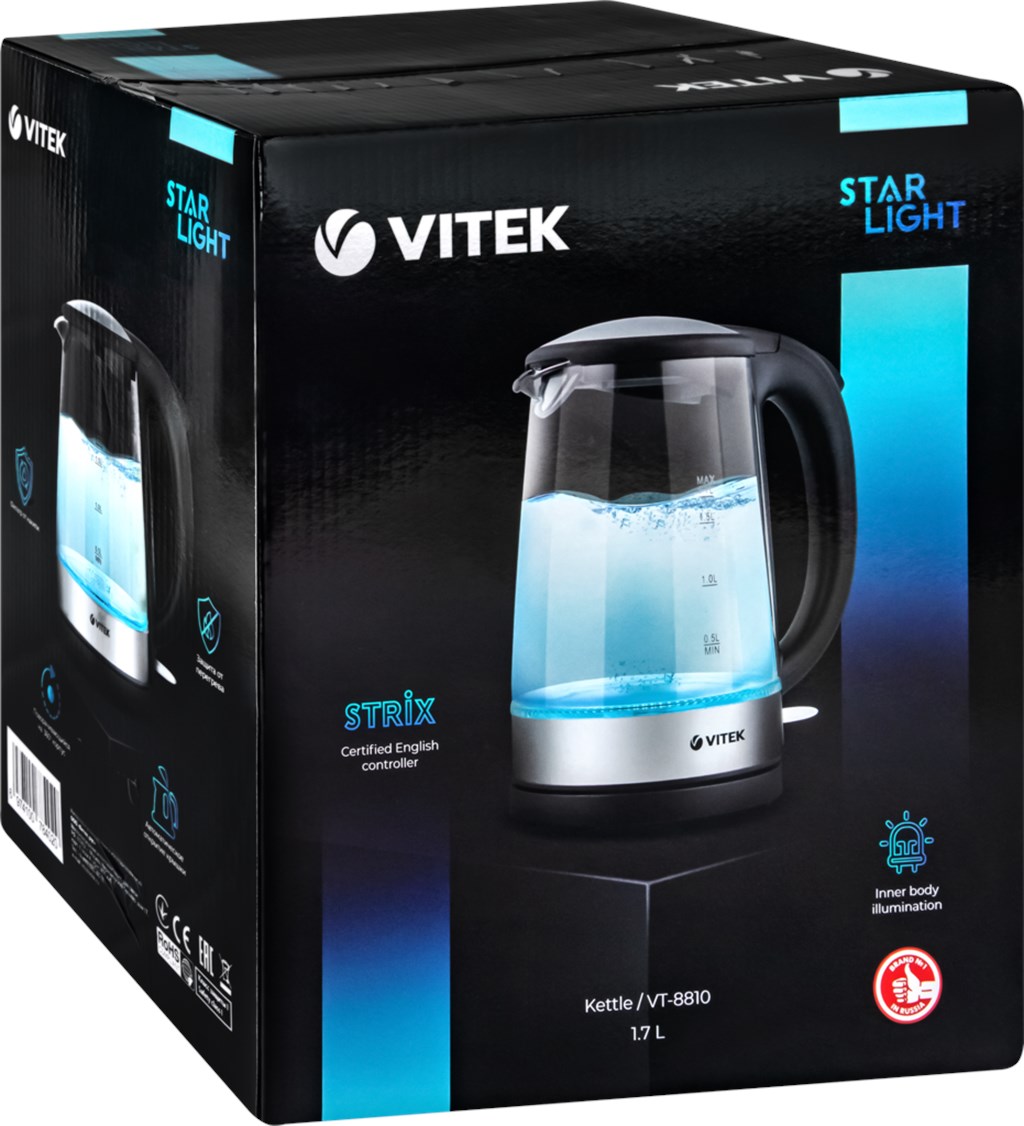Быстро вскипятить 1,7 л воды поможет вам чайник VITEK VT-8810 мощностью 2200 Вт, корпус которого изготовлен из высококачественного термостойкого стекла. Внутренняя подсветка корпуса, гармонично сочетающаяся со стильными стальными элементами, делает использование прибора очень приятным. Прибор оснащен сертифицированным английским контроллером STRIX, благодаря которому прибор будет служить вам долго и надежно. Чайник имеет защиту от перегрева и автоматически отключается при закипании или отсутствии воды. Пользоваться им очень удобно: он способен поворачиваться на 360°, а его крышка открывается механически, нажатием на кнопку. Съемный фильтр, расположенный внутри носика прибора, защитит напитки от накипи. Нагревательный элемент прибора встроен в плоское дно и защищен стальной пластиной, поэтому ухаживать за устройством очень легко.