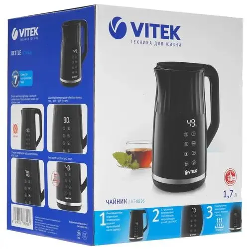 Лаконичные формы и элегантный дизайн чайника VITEK VT-8826 превратят его в один из самых желанных аксессуаров на Вашей кухне! Корпус чайника выполнен из высококачественного пластика в комбинации с нержавеющей сталью в форме элегантного кувшина. Благодаря технологии Cool touch он абсолютно безопасен в работе: поверхность не нагревается в процессе кипячения воды! В чайнике предусмотрено 4 автоматических режимов подогрева воды — 70°С /80°С/ 90°С/100°С и 13 режимов регулировки температуры нагрева воды: от 40 до 100 °С, а также функция поддержания температуры (до 2 часов). Нельзя не отметить инновационную индикацию температуры воды, расположенную на фронтальной части корпуса. Смотрится очень стильно и современно! Нагревательный элемент чайника VT-8826 встроен в плоское дно и надежно защищен стальной пластиной, это позволяет не только сделать чайник привлекательным даже изнутри, но и делает его чистку максимально удобной. Среди характеристик безопасности использования чайника стоит отметить отключение при отсутствии воды и автоотключение при закипании воды. Для удобства чайник обеспечен местом для хранения шнура. Максимальная мощность чайника - 2200 Вт, максимальный объем - 1,7л.