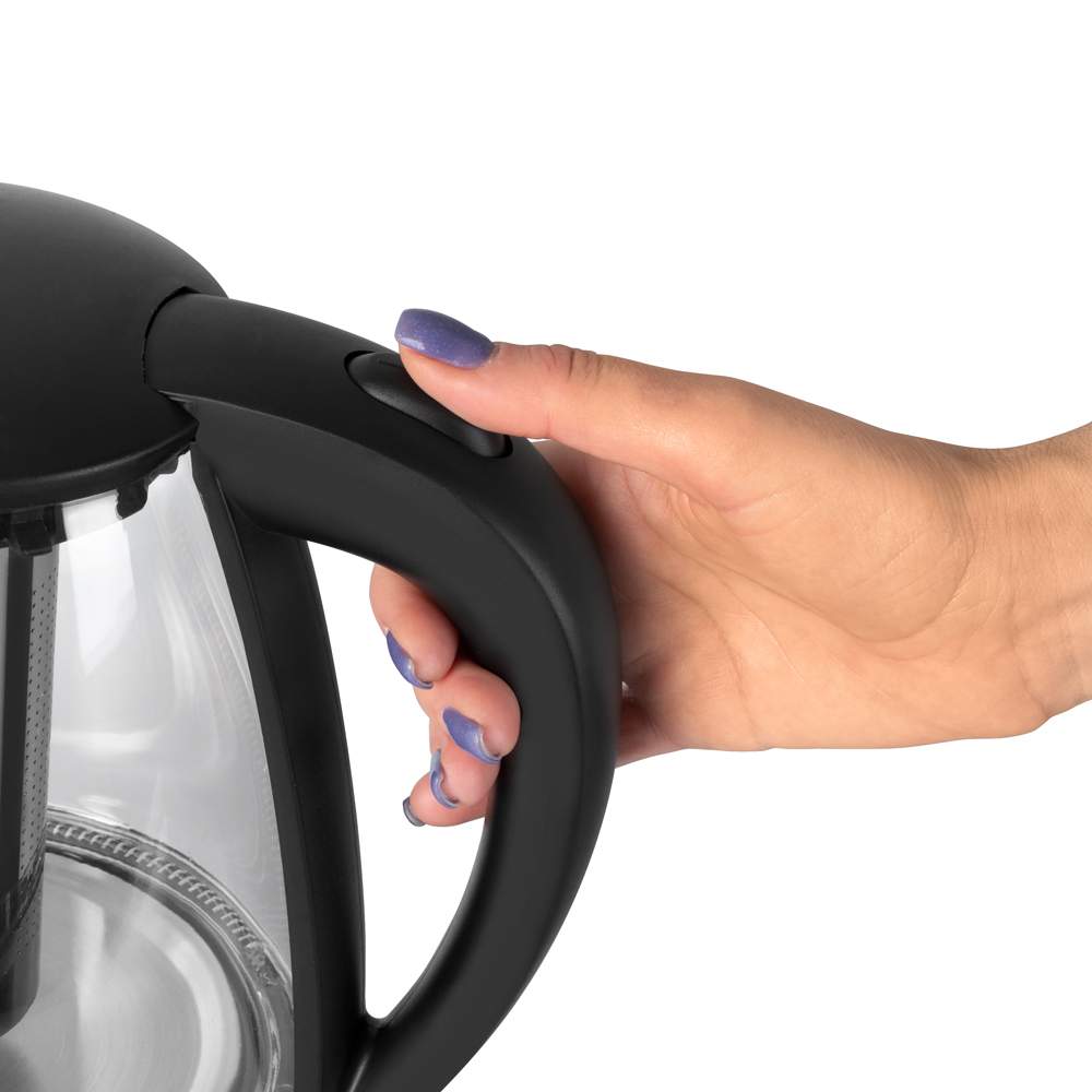 Беспроводное соединение позволяет вращать чайник на подставке на 360 градусов, Корпус из высококачественного стекла, Светодиодная подсветка корпуса, Автоотключение при закипании воды, Автоотключение при отсутствии воды, Функция поддержания температуры 65°С-85°С, Индикатор функции поддержания температуры, Съемное сито из нержавеющей стали для заваривания разных сортов чая внутри чайника, Фильтр-сетка для защиты от накипи, Эргономичная ненагревающаяся ручка, Шкала уровня воды, Защита от перегрева, Скрытый нагревательный элемент