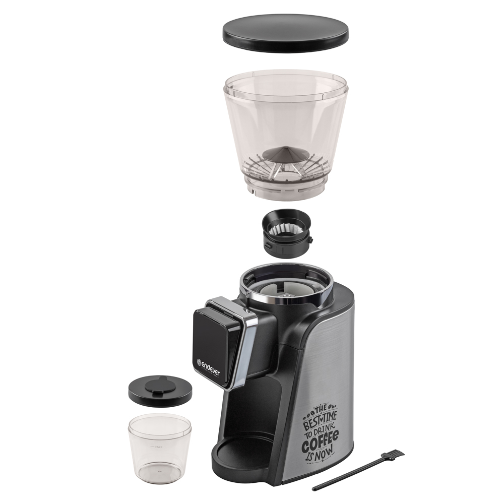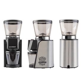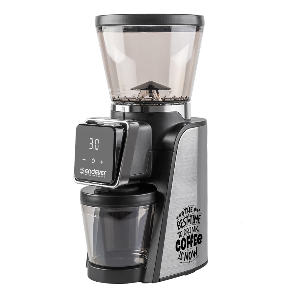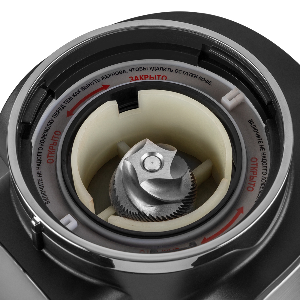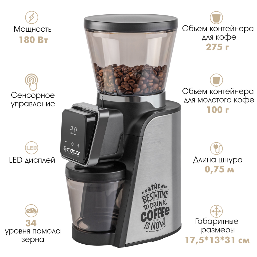34 уровня помола зерна, Сенсорное управление, Объем контейнера для кофе: 275 г, Объем контейнера для молотого кофе: 100 г, Низкоскоростной мотор не позволяет перегреть зерна при помоле, LED дисплей и удобное сенсорное управление, Низкий уровень шума, Технология Anti Static, чтобы молотый кофе не прилипал к стенкам контейнера, Прорезиненные ножки, Съемные стальные конические жернова, Защита от перегрева двигателя, Функция автоотключения
