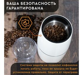 Система защиты не позволяет кофемолке начать работу, пока ее крышка не будет установлена правильно. Ваша безопасность гарантирована, а кофе никогда не пропадет.