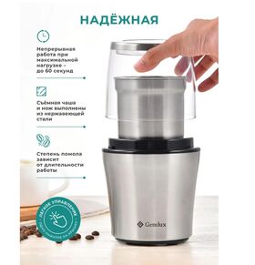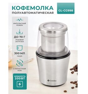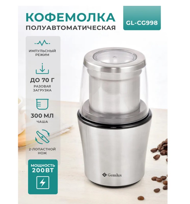 Полуавтоматическая кофемолка Gemlux GL-CG998 оснащена съемной чашей емкостью 300 мл из нержавеющей стали с 2-лопастным ножом. Запуск двигателя происходит при нажатии на крышку чаши. Устройство измельчает за один прием около 70 г зернового кофе. Степень помола (от грубого для френч-пресса до тонкого для турки) зависит от длительности работы. Время непрерывной работы ножевой кофемолки при максимальной нагрузке -до 60 секунд. Для получения наилучших результатов рекомендуется производить помол в импульсном режиме с 10-секундными интервалами. Корпус кофемолки изготовлен из нержавеющей стали с элементами из пластмассы.