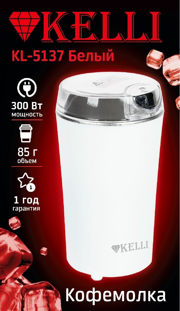 Представляем вам кофемолку от надежного бренда Kelli, модель KL-5137. Устройство обладает мощностью 300 Ватт и вместимостью 85 грамм, чего вполне достаточно для домашнего использования или небольшого офиса. Корпус кофемолки выполнен из качественного пластика, а лезвия изготовлены из нержавеющей стали для долгой и надежной службы.