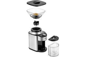 Контейнеры для молотого кофе и для зерен съемные и закрываются крышками. Внешний жернов также съемный — для удобства очистки. В комплекте предусмотрена мерная ложка с маленькой щеткой на конце для чистки жерновов.