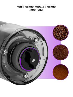 Устройство оснащено коническими жерновами из керамики, которые не стираются и не ржавеют со временем использования, и более долговечны. Для регуляции степени помола поворачивайте регулятор по часовой стрелке, чтобы уменьшить, и против – чтобы увеличить.