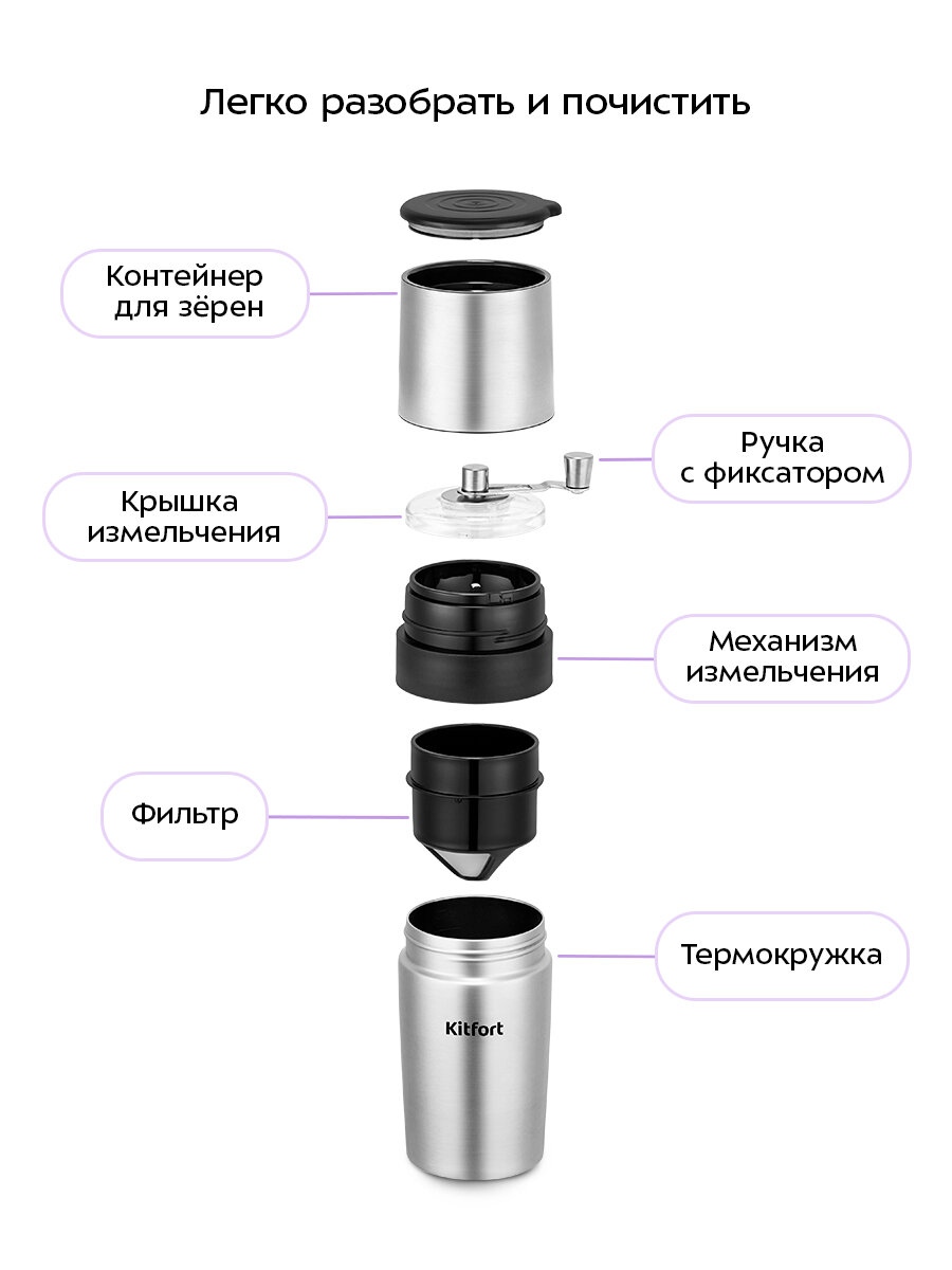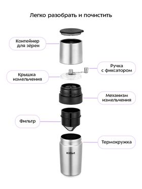 КТ-7533 имеет множество внутренних слоёв: контейнер для зёрен, измельчитель, ручка с регулятором помола, фильтр и термокружка. Прибор прост в использовании и уходе, так как все составляющие съёмные и легко промываются проточной водой.
