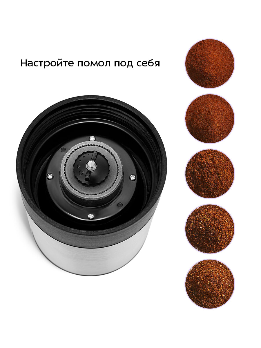 Жерновая кофемолка даёт равномерный помол, при этом кофе не перегревается, как это происходит в роторных кофемолках. Для регулировки помола на дне контейнера для зёрен расположен регулятор, вращая который вы сможете настроить помол кофе под себя.