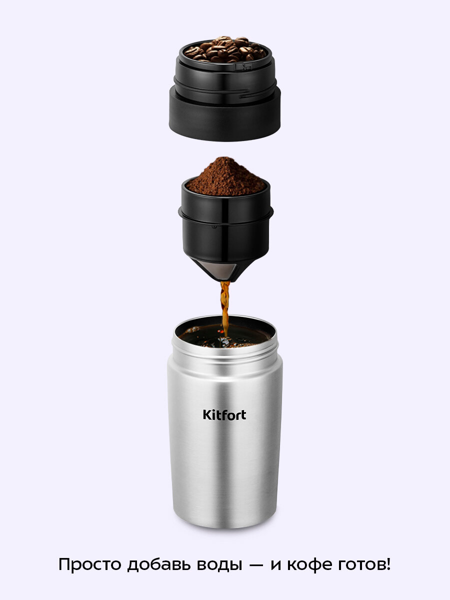 Ручная кофемолка «3 в 1» КТ-7533 совмещает в себе функцию не только кофемолки, но и капельной кофеварки, а также она позволяет брать кофе с собой в термокружке. Термокружка имеет крышку с отверстием для питья.