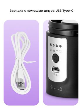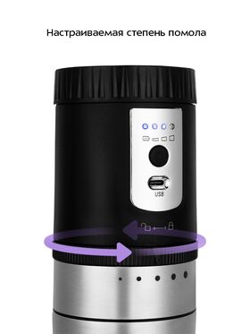 Устройство работает от встроенного аккумулятора. Зарядка кофемолки осуществляется с помощью шнура USB Type-C, который идёт в комплекте.