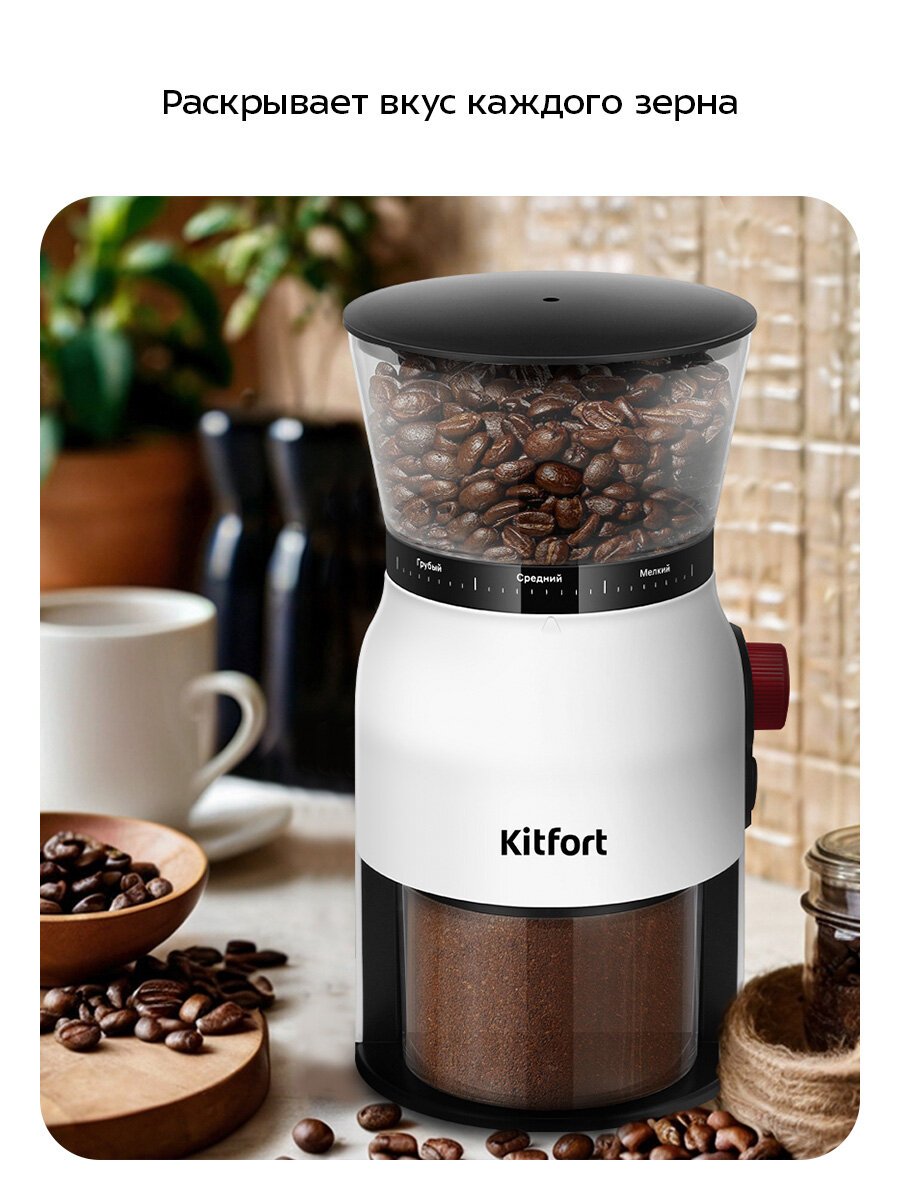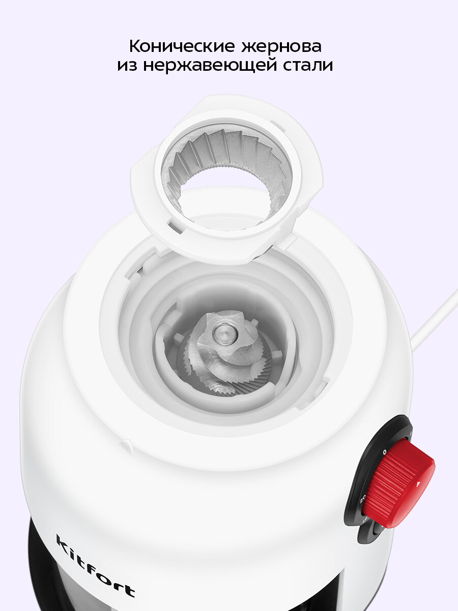 Жерновая кофемолка КТ-7566 с коническими жерновами из нержавеющей стали не просто измельчает – она раскрывает аромат каждого зерна. Мощный мотор 150 Вт справляется быстро, без надрыва и перегрева.