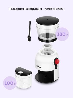 Контейнеры для молотого кофе (100 г) и для зёрен (180 г) изготовлены из прозрачного материала, что позволяет наблюдать за процессом помола. Оба контейнера и внешний жёрнов съёмные, что значительно упрощает процесс очистки.