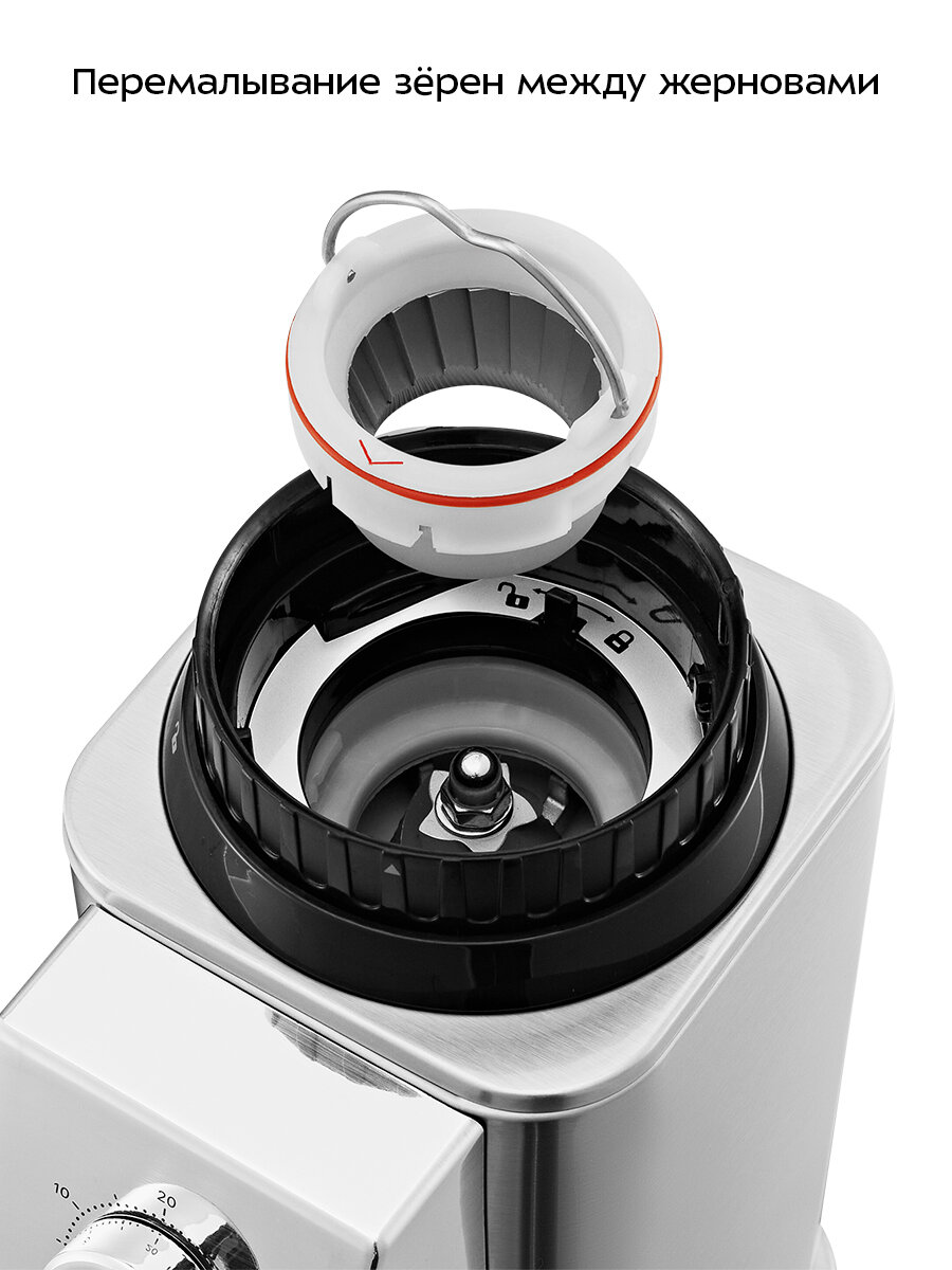 Контейнеры для молотого кофе и для зёрен съёмные и закрываются крышками. Внешний жёрнов также съёмный — для удобства очистки. В комплекте предусмотрена щётка для чистки жерновов.