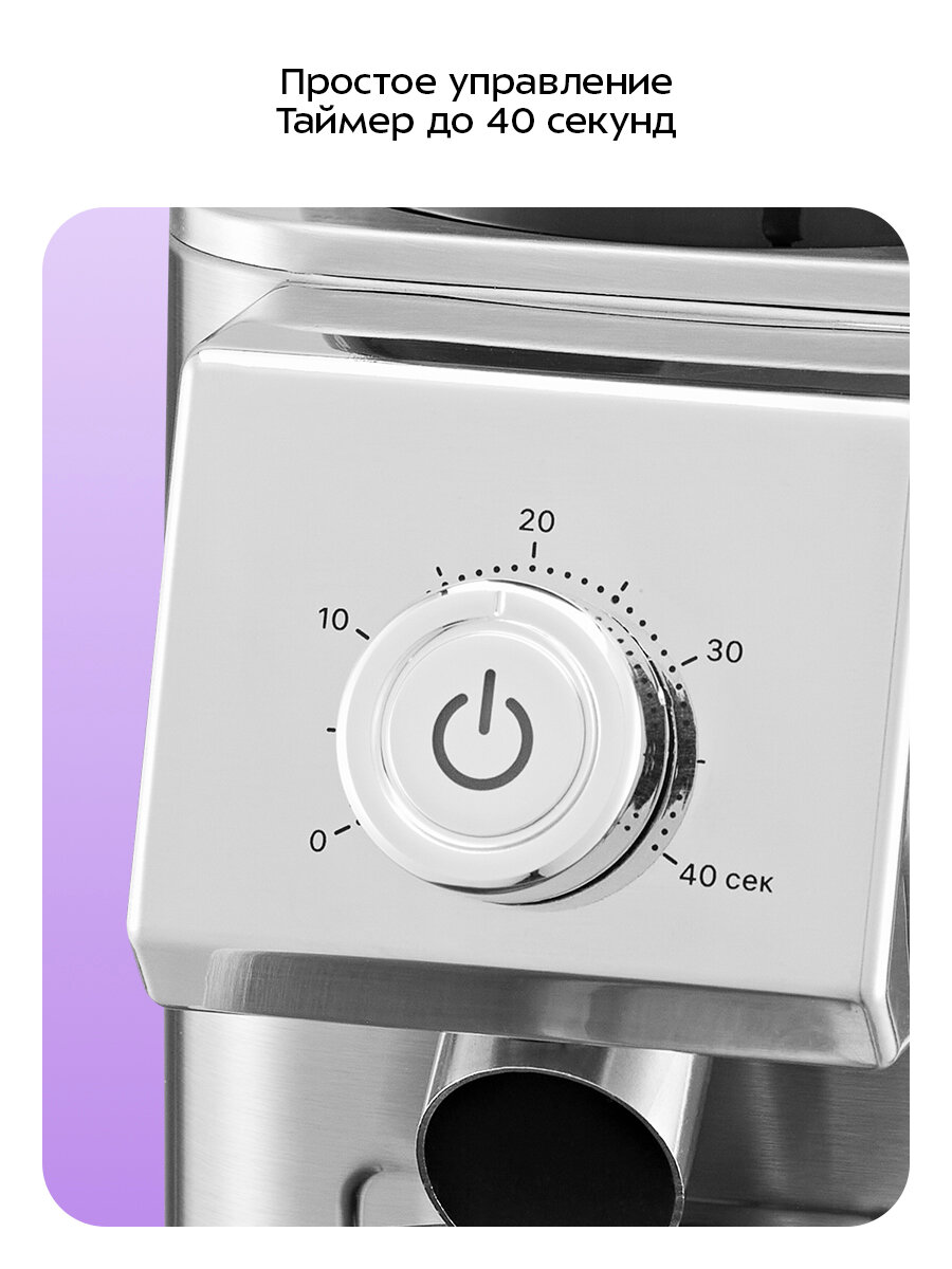 Кофемолка имеет простое управление. КТ-7589 позволяет выбрать время помола от 10 до 40 секунд при помощи регулятора на передней части.