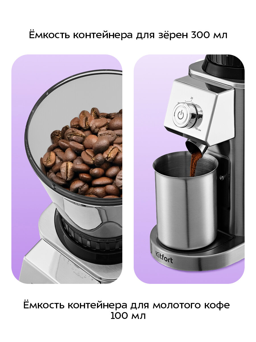 Кофемолка позволит перемолоть действительно большое количество кофе. Ёмкость контейнера для зёрен составляет 300 мл, а контейнера для молотого кофе 100 мл.