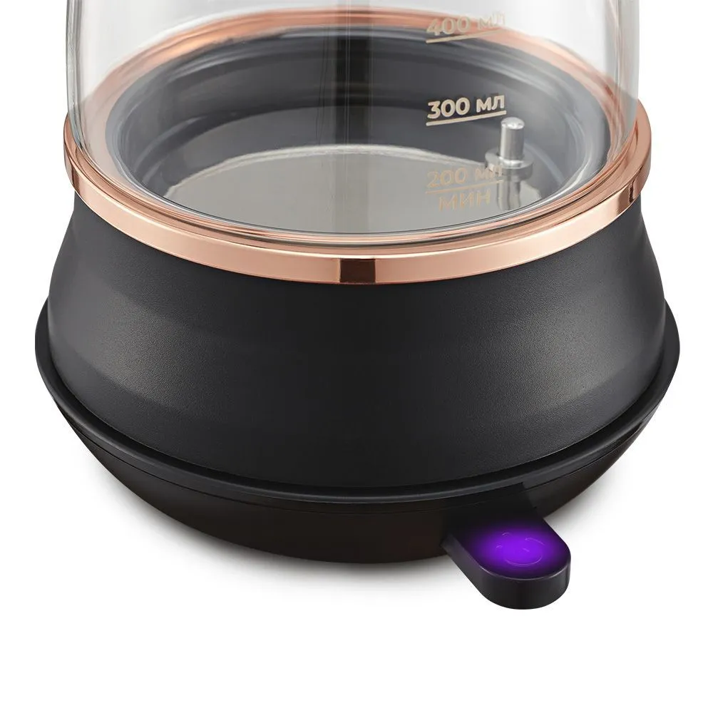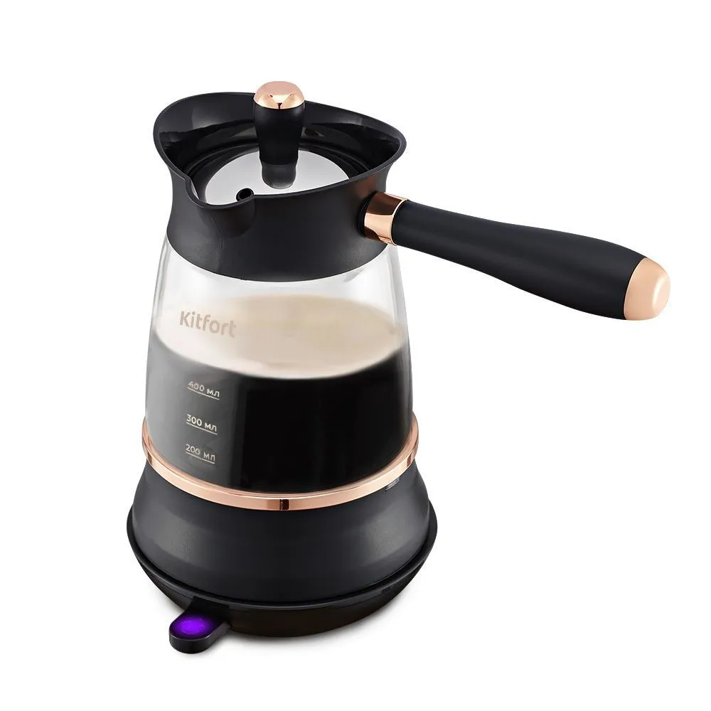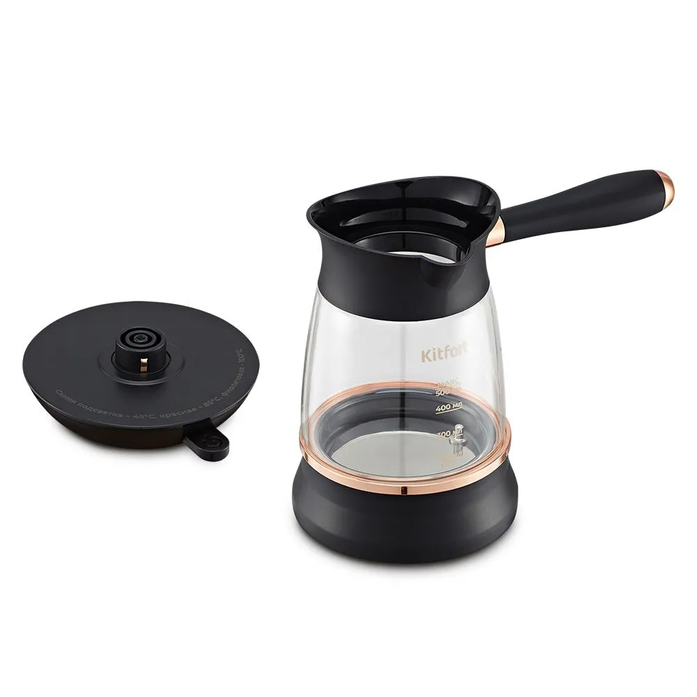 Кнопка «Вкл/Выкл» включает, переключает температуру нагрева 45, 85 или 100 °С и выключает турку. После включения турка будет работать в течение 3 часов в режиме поддержания температуры. У турки есть световой индикатор, который горит во время работы турки.