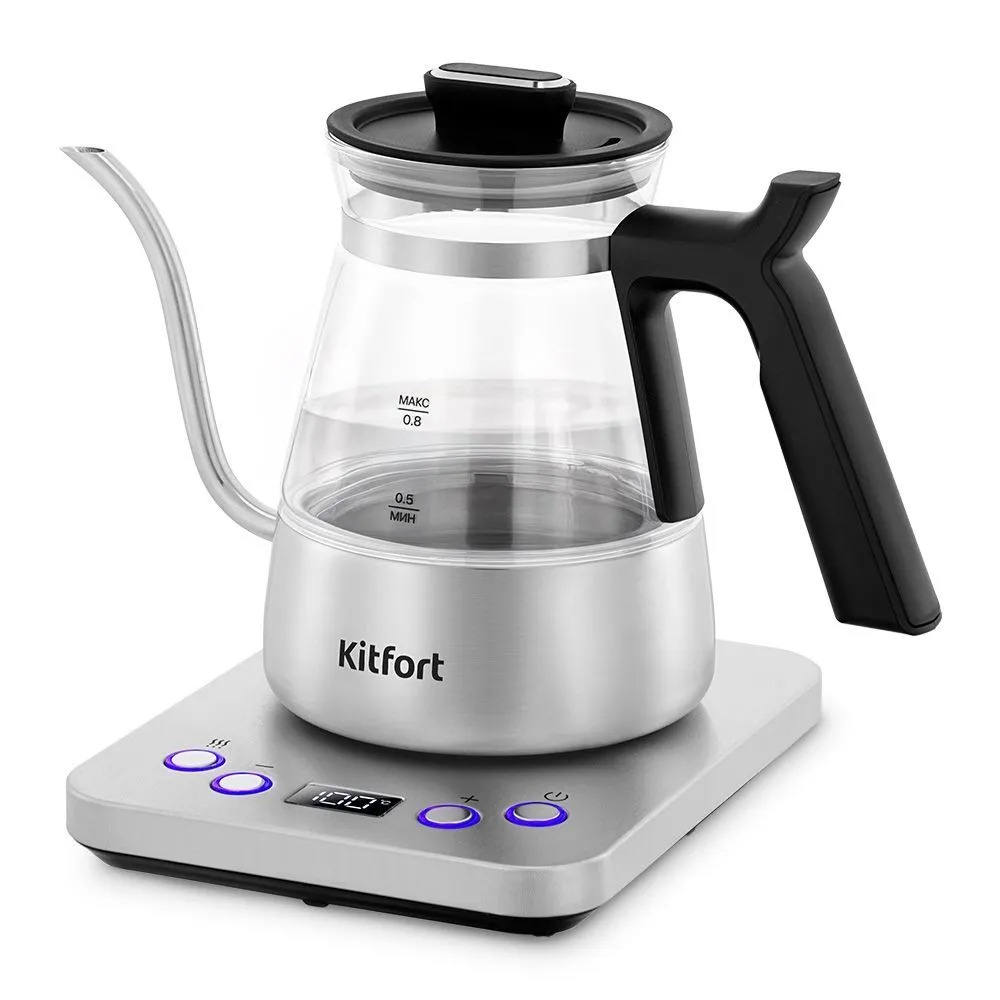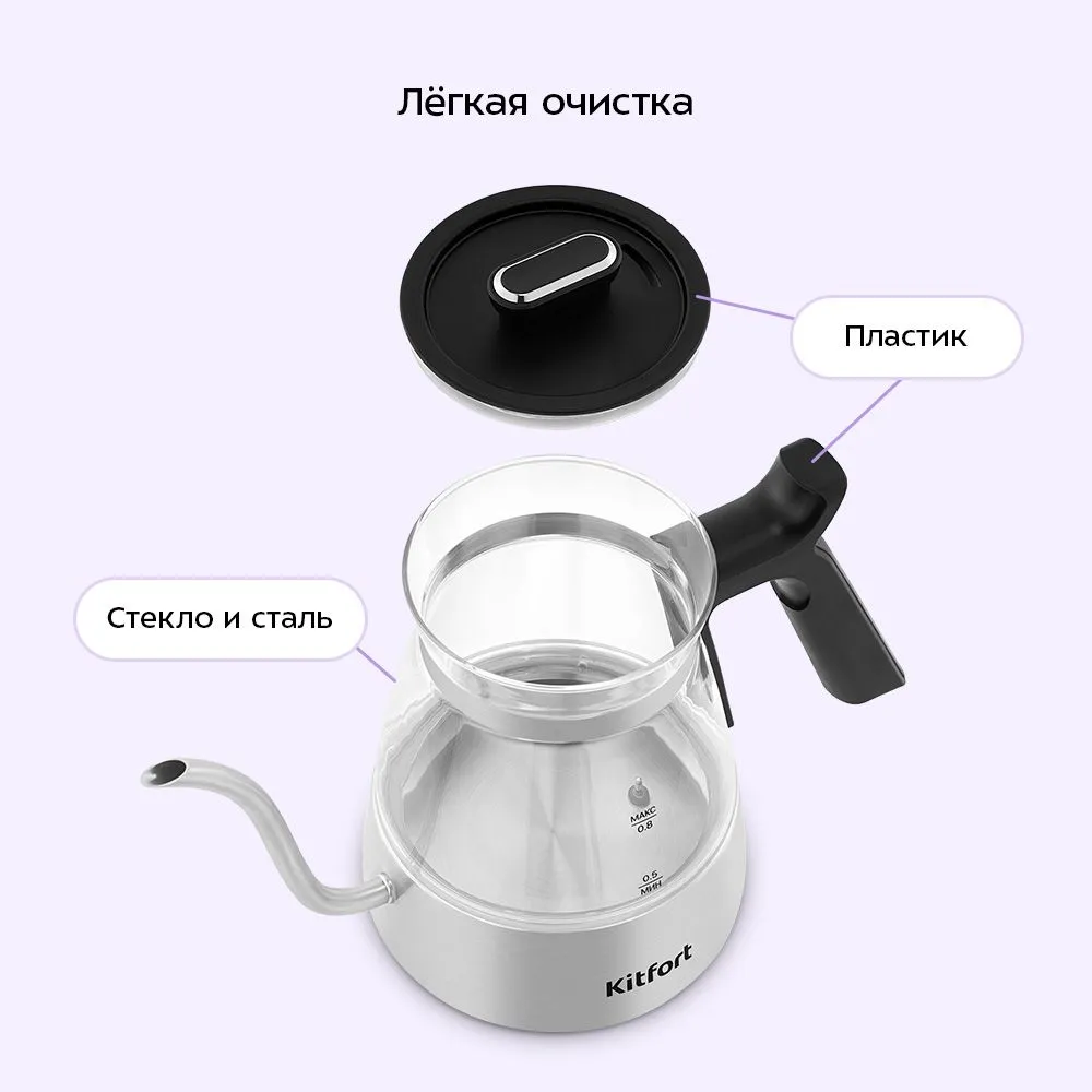Чайник КТ-8707 с мощностью 1300 Вт предназначен для кипячения воды и приготовления кофе методами кемекс или пуровер. Тонкий носик позволяет аккуратно добавлять воду, обеспечивая равномерную экстракцию и полное раскрытие вкуса и аромата напитков.
