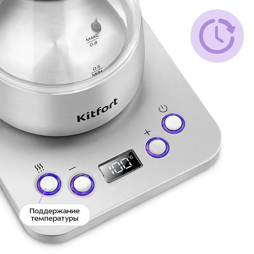 На подставке чайника расположены панель управления и LED-дисплей. Он показывает текущую температуру воды или настраиваемую, а также время отложенного старта. Вы можете выбрать время нагрева и поддержания температуры в диапазоне от 1 до 6 часов.