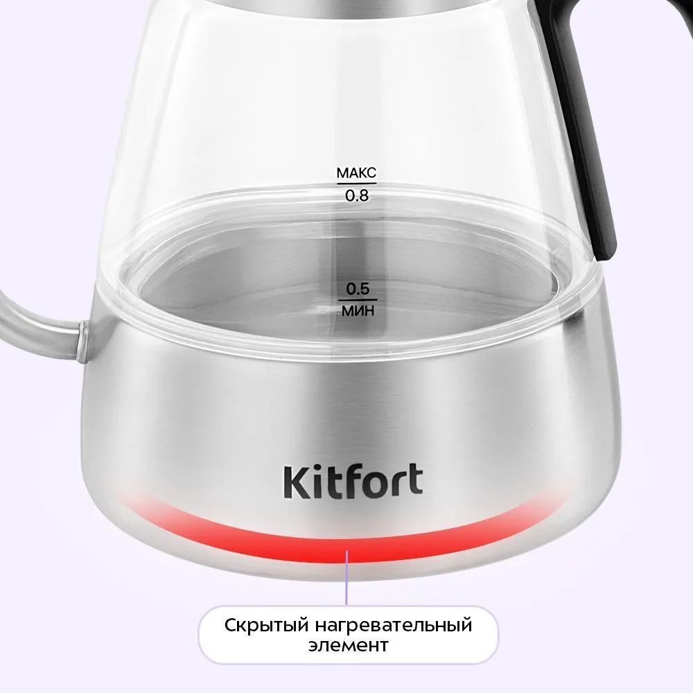 Чайник КТ-8707 объёмом 0,8 литра вскипятит воду за 5 минут. Он оснащён функцией безопасности: автоматическое отключение при закипании предотвращает перегрев и повреждение устройства. Он также не включится без воды и не нагреется, исключая риск поломки