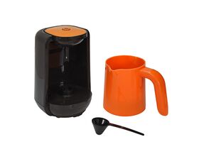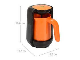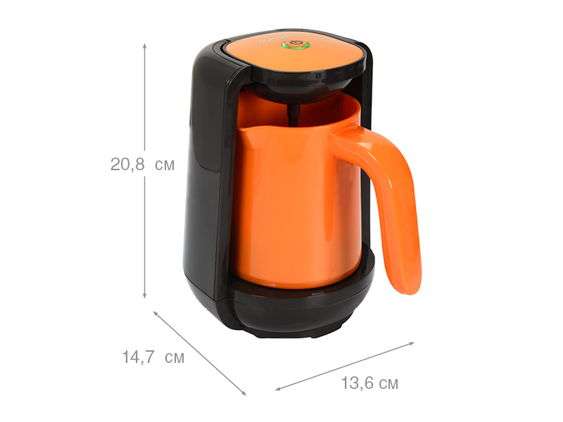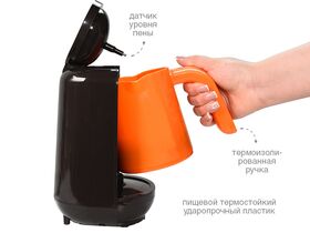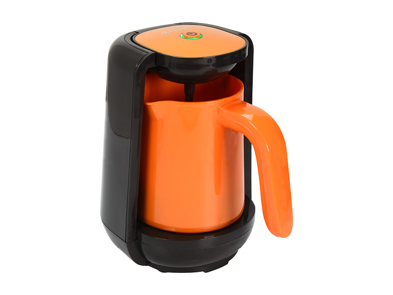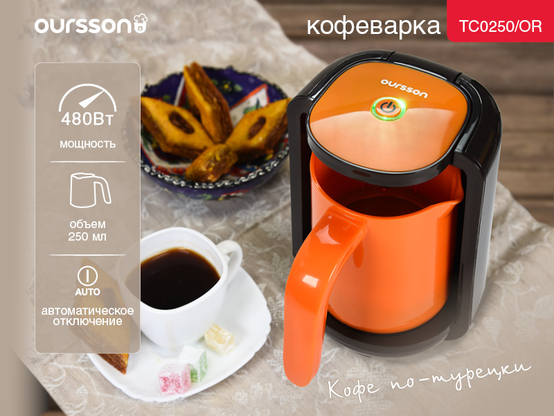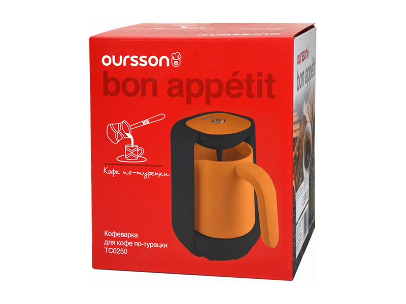 Кофеварка для кофе по-турецки TC0250 Oursson – отличный выбор для тех, кто предпочитает приготовление настоящего восточного кофе у себя дома. Нажатием всего одной кнопки кофеварка за 3,5 минуты приготовит 250 мл ароматного бодрящего кофе. В электрической кофеварке Oursson процесс варки кофе автоматизирован и занимает считанные минуты. Вы просто добавляете воду, молотый кофе и включаете кнопку - кофеварка сама приготовит для вас ароматный напиток. При нажатии кнопки включения загорится световой индикатор - приготовление началось. Вам больше не нужно следить за тем, чтобы кофе не убежал. Как только напиток будет готов, прозвучит звуковой сигнал и кофеварка отключится автоматически. Снимите кувшин с базы, держась за термоизоляционную ручку и перелейте свежеприготовленный напиток в вашу любимую кофейную кружку. Для удобства чаша прибора снабжена двумя носиками – кофе можно налить правой или левой рукой.В кофеварке так же предусмотрена функция автоматического отключения при недостаточном уровне воды в чаше (менее 100 мл) или при открытой крышке прибора.