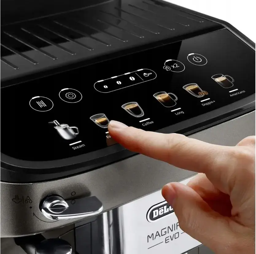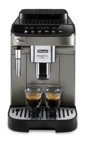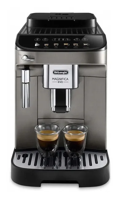 Кофемашина DeLonghi Magnifica Evo ECAM290.42.TB — это стильное, удобное в использовании устройство, которое придется по вкусу каждому любителю кофе . Благодаря этому вы сможете насладиться отличным кофе из свежемолотых зерен , не выходя из собственного дома. Приготовьте идеальный итальянский эспрессо и другие кофейные и молочные напитки, используя рецепты, доступные на интуитивно понятном цветном дисплее с сенсорными значками . 5 рецептов в одно касание , включая эспрессо и лонг. Насадка для ручного вспенивания молока позволяет получить кремообразную молочную пену. Решетку лотка и контейнер для молока можно мыть в посудомоечной машине , а функция автоматической очистки графинаобеспечивает высочайший уровень гигиены. Современный дизайн с элегантной титаново-черной отделкой кофемашины DeLonghi Magnifica Evo — необходимый акцент на любой современной кухне.