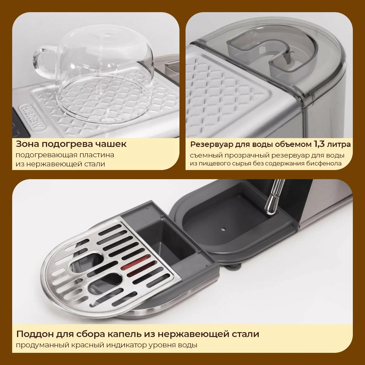 индикатор уровня воды, индикация отсутствия кофе, съемный лоток для сбора капель