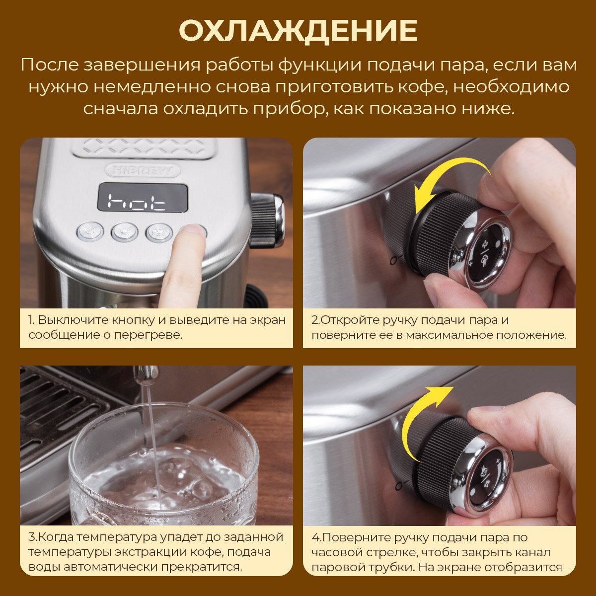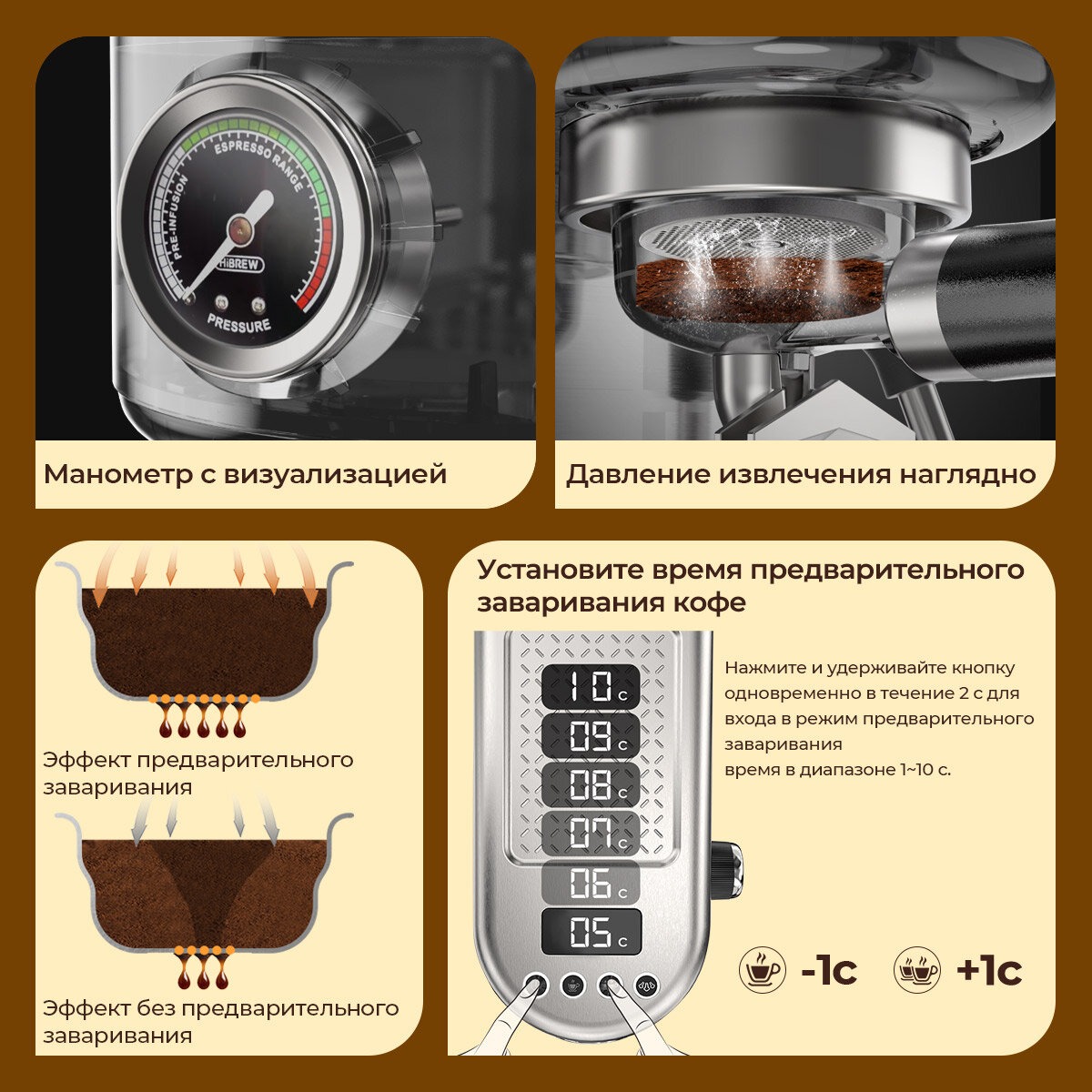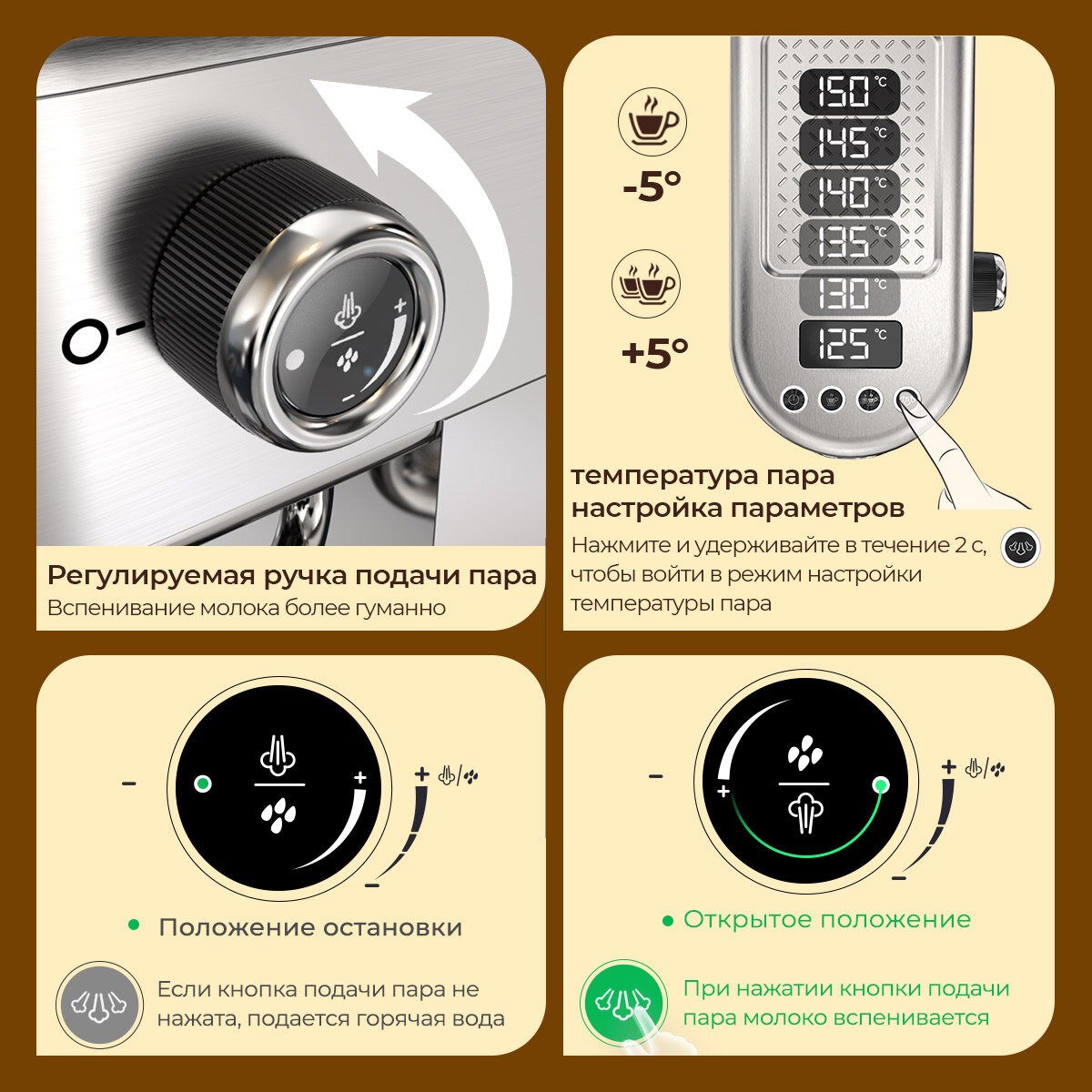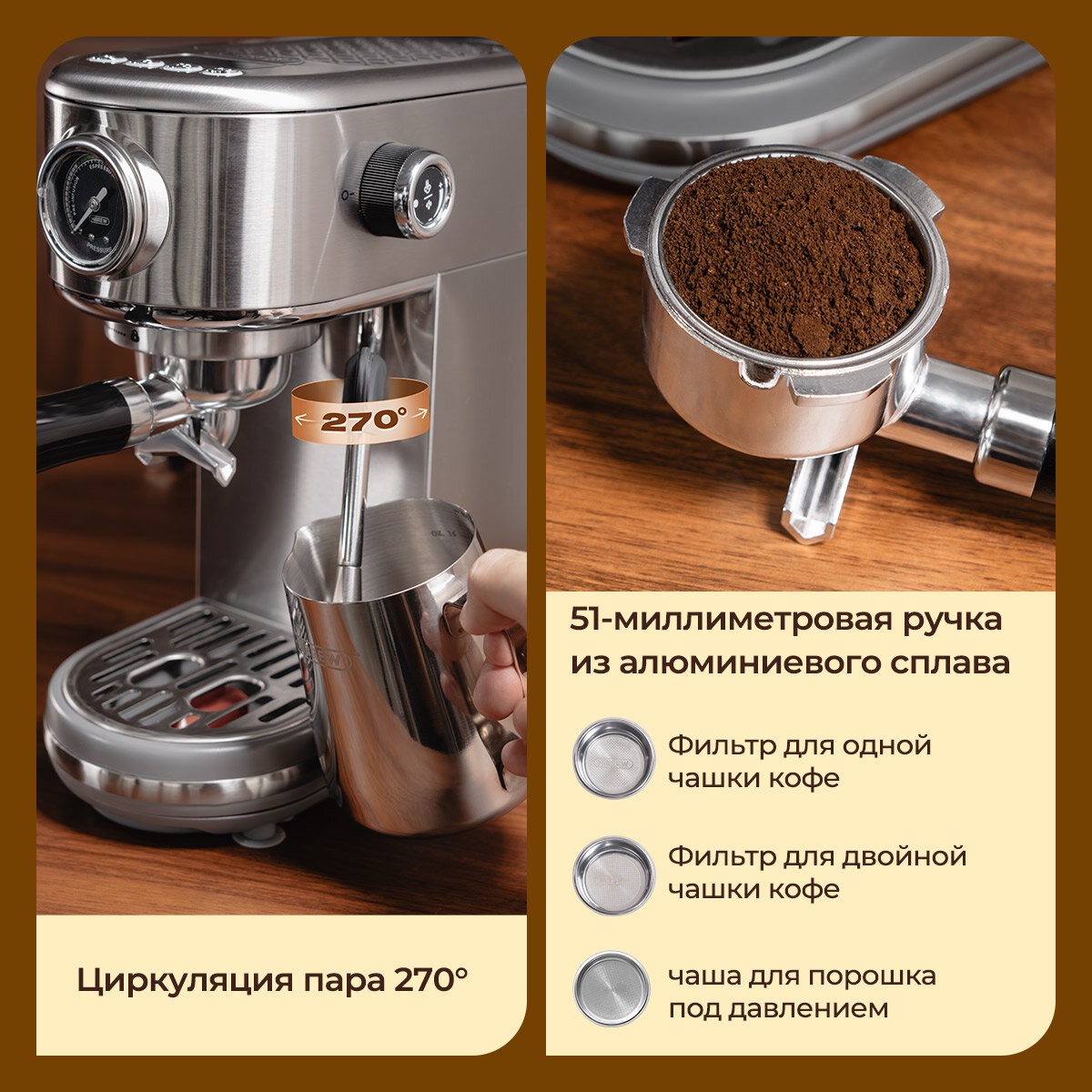 Конструкция кофеварок/кофемашин: Встроенный термометр, Дисплей, Фильтр от накипи, Противокапельная система, Парогенератор