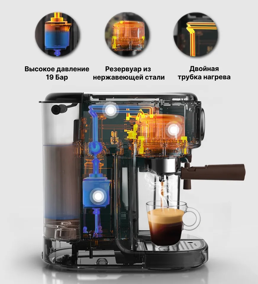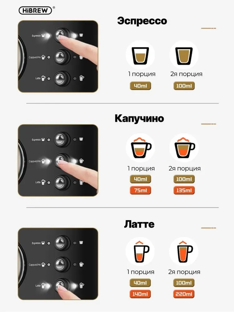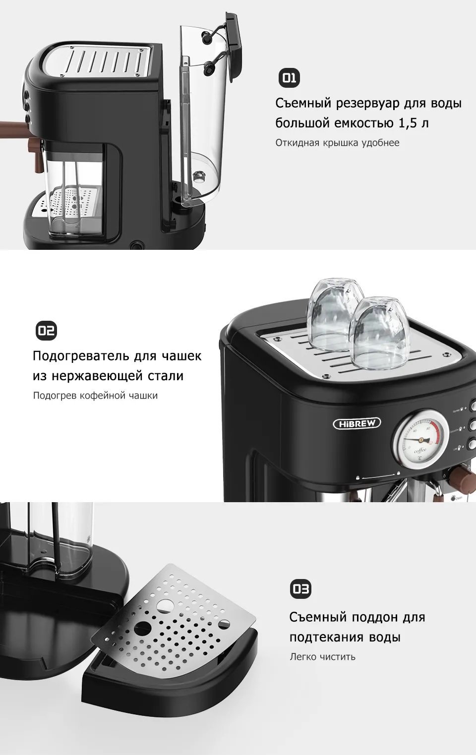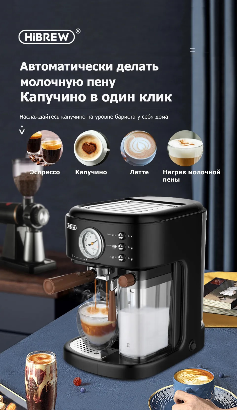 Кофемашина Hibrew H8A оснащена мощным насосом и нагревательным элементом, что позволяет ей быстро нагреться и приготовить кофе за несколько минут. Она подходит как для приготовления эспрессо, так и для других кофейных напитков, таких как капуччино, латте или американо.