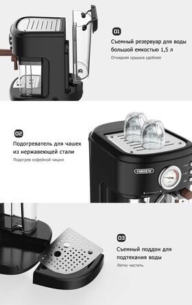 Модель Hibrew H8A имеет компактные размеры, что облегчает ее размещение на столе или в другом месте. Кофемашина легка в уходе, так как оснащена съемным и легко моющимся резервуаром для воды, а также съемными частями, которые можно просто промыть под водой.