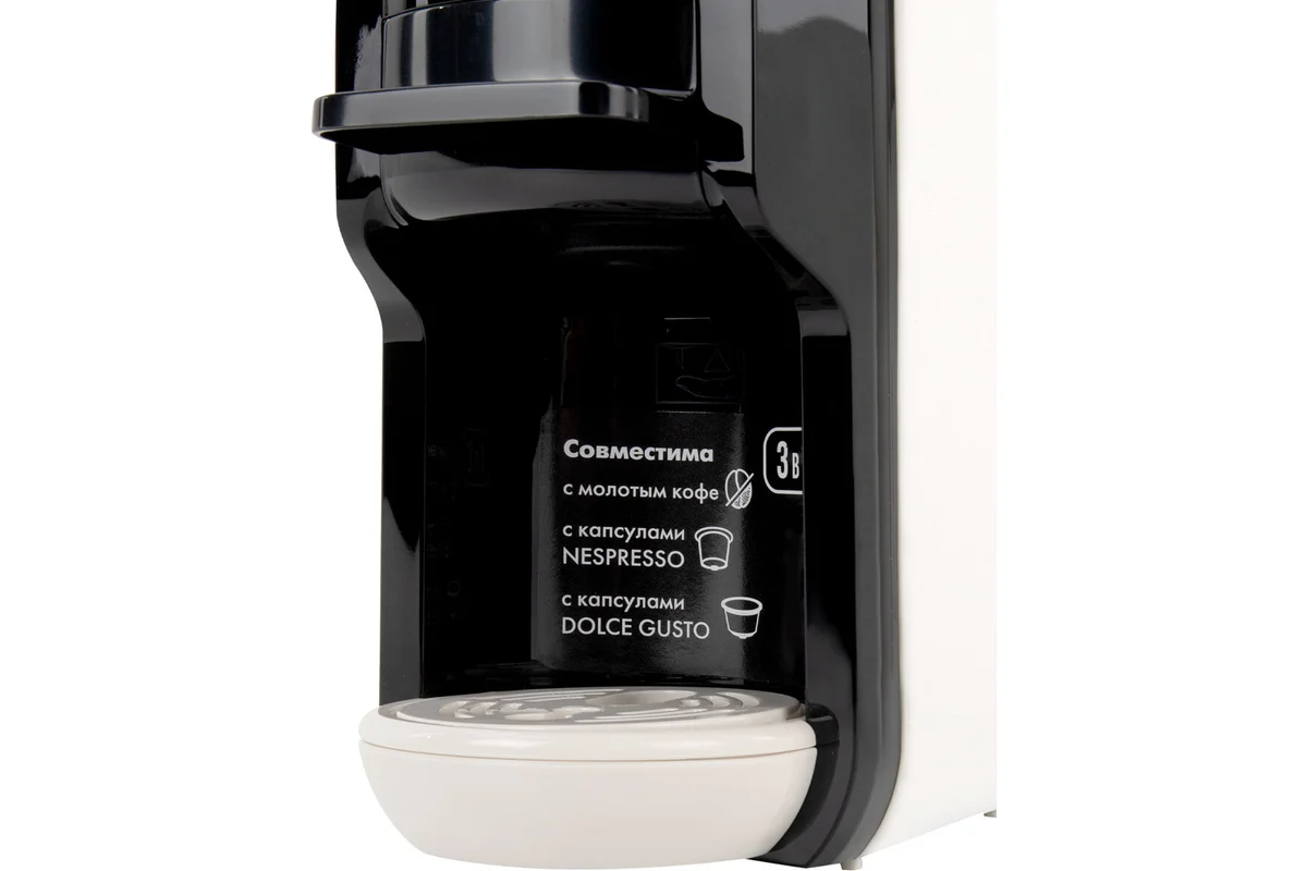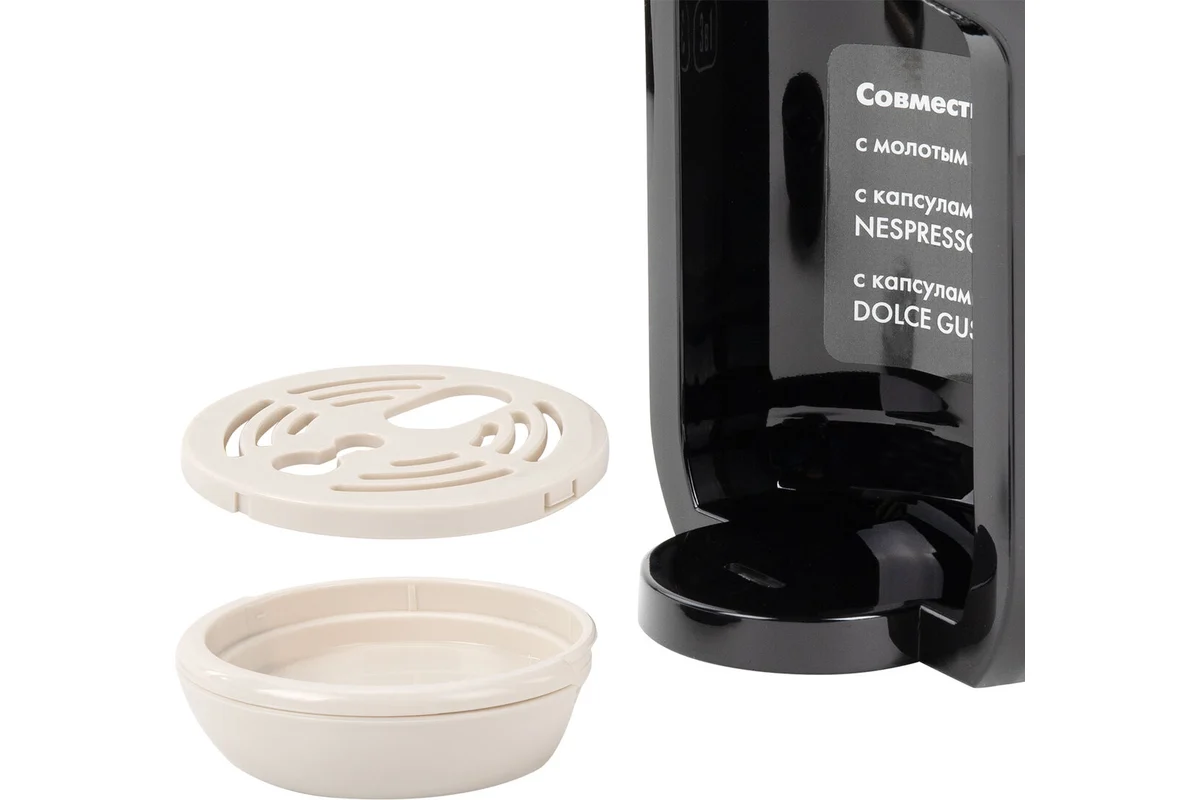 Универсальная - подходит для молотого кофе или для капсул DOLCE GUSTO и NESPRESSO