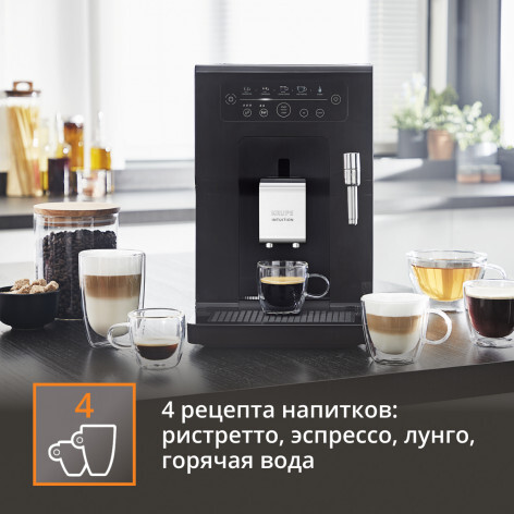 Кофемашина имеет 4 предустановленных рецепта кофейных напитков, которые можно регулировать по вашему вкусу. Функция пара позволяет вручную вспенивать молоко для капучино, латте макиато и других напитков.
