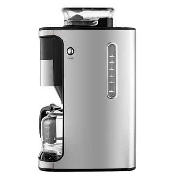 Корпус выполнен из брашированного металла со вставками из высококачественного пластика черного цвета. Одна из особенностей модели- жаропрочный кофейник объемом 1,5 л. Ручка сделана из теплостойкого пластика и не нагревается от горячего кофейника. Резервуар для воды оснащен мерной шкалой.