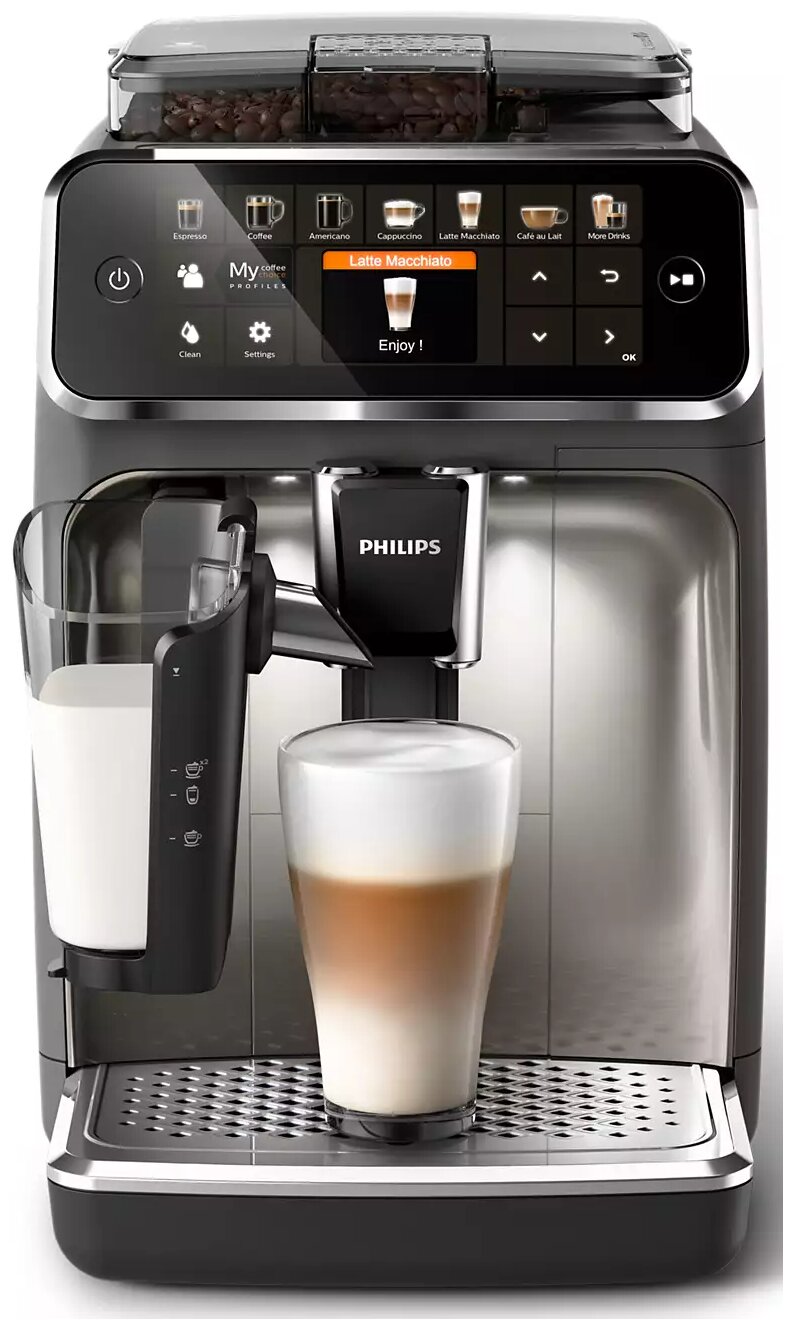 капучинатор LatteGo; простое и быстрое удаление отходов; в комплекте: фильтр AquaClean, мерная ложка, тестовая полоска для проверки жесткости воды, тюбик со смазкой; длина сетевого шнура 1 м; емкость кувшина для молока 0.26 л; 4 пользовательских профиля, в которых хранятся ваши особые рецепты