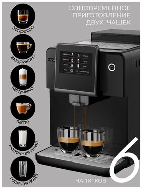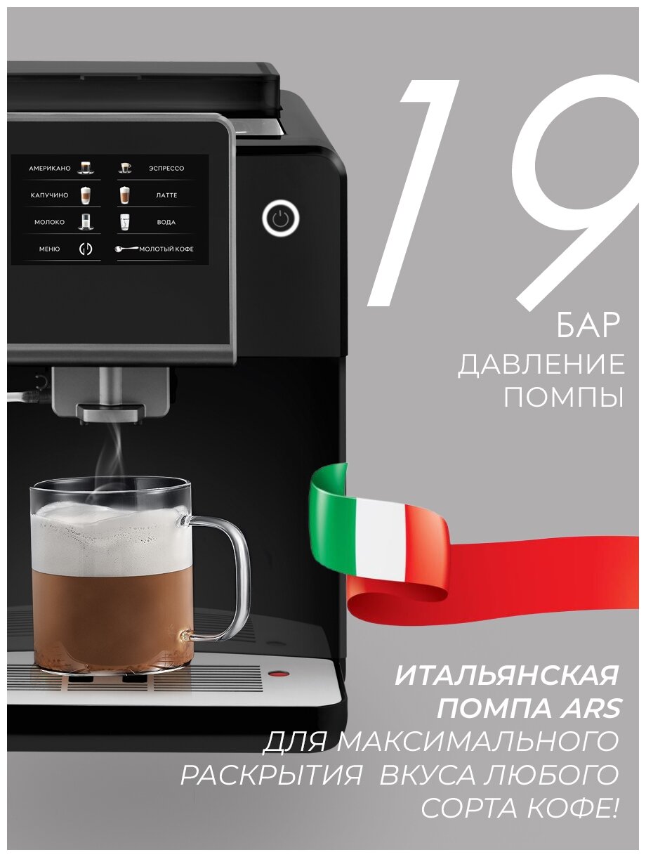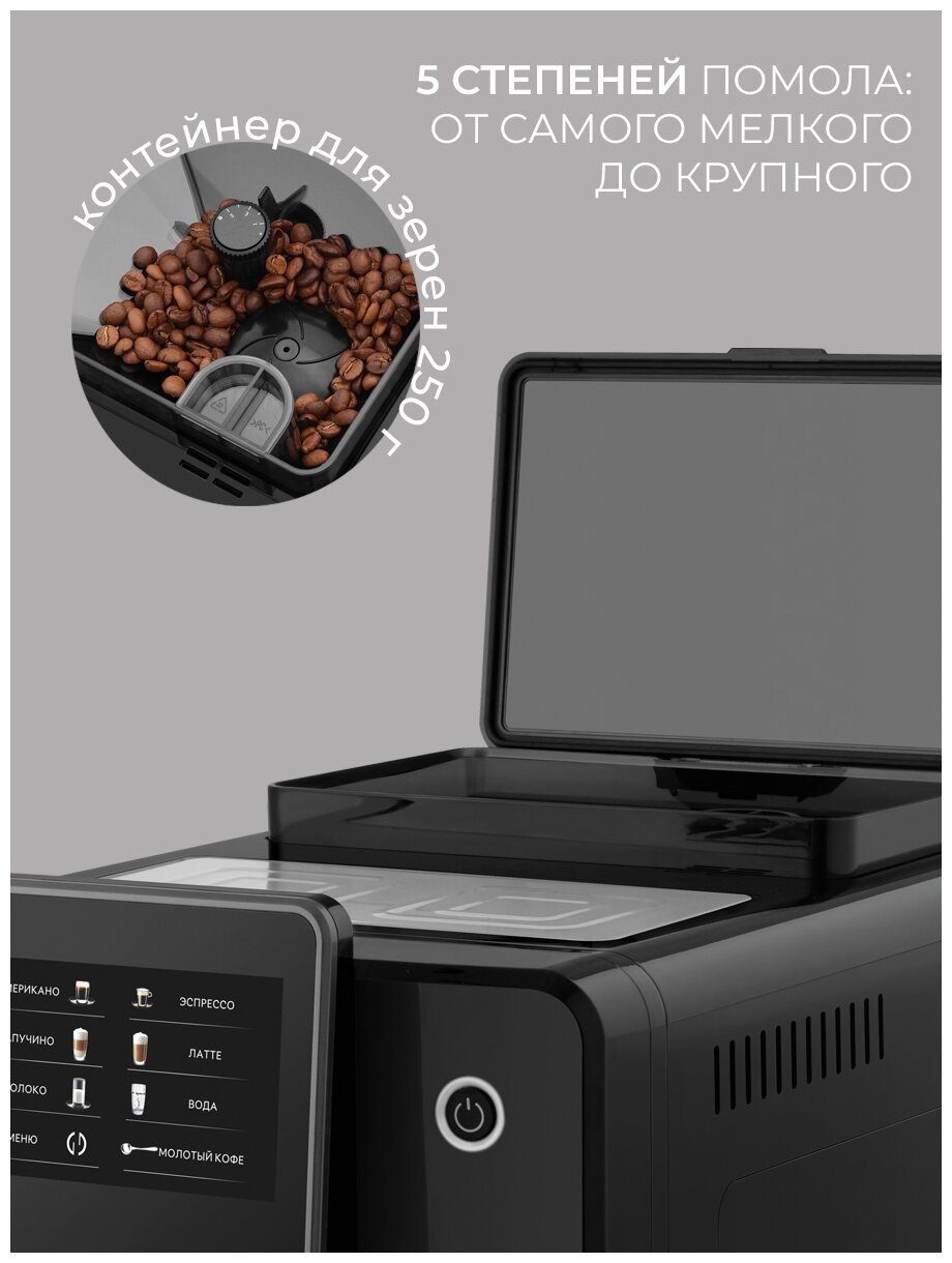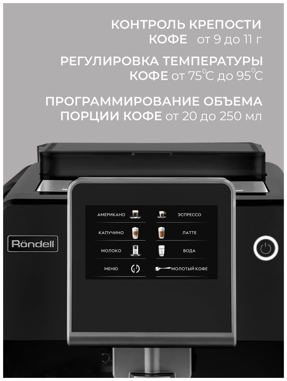 В процессе приготовления любимого напитка вы можете выбирать не только степень крепости кофе (9–12 г) и его температуру (75–95°С), но и его объем (20–250 мл), а также количество добавляемого молока.