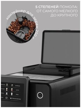 Особый комфорт при использовании устройства обеспечивает встроенная коническая кофемолка, имеющая 5 степеней помола. Она соединена со специальным контейнером для хранения зерен объемом 250 г.