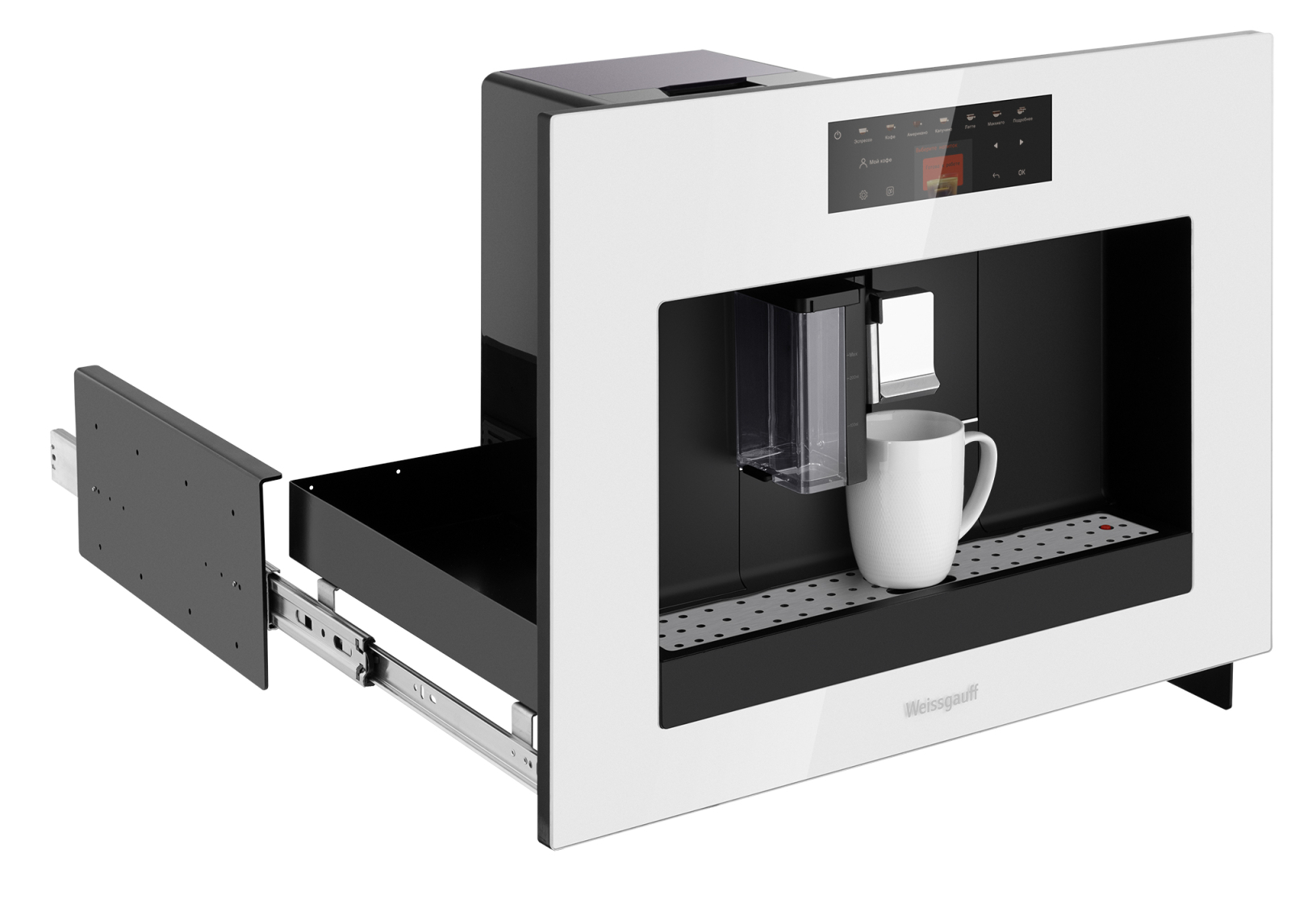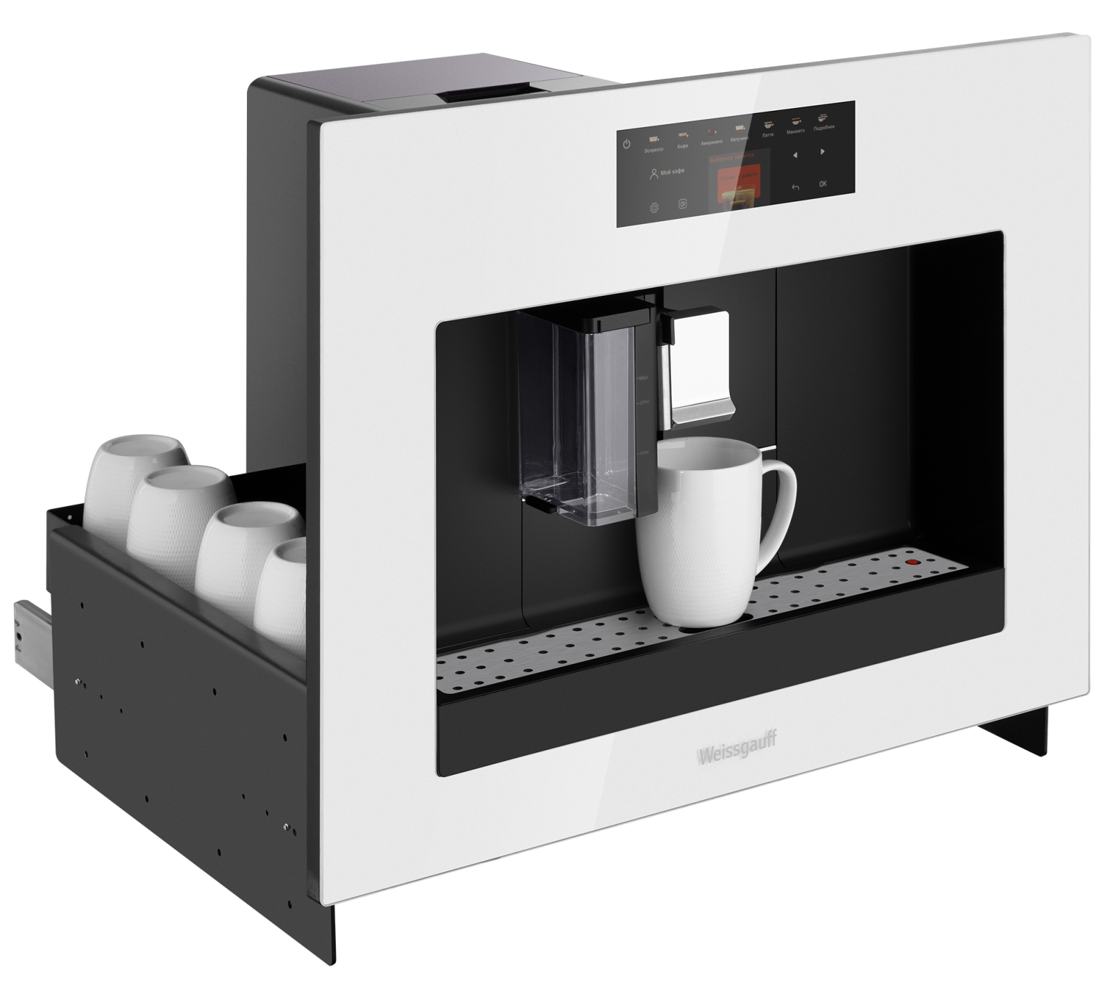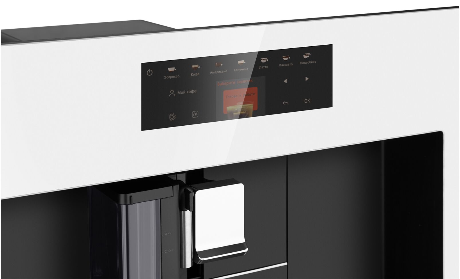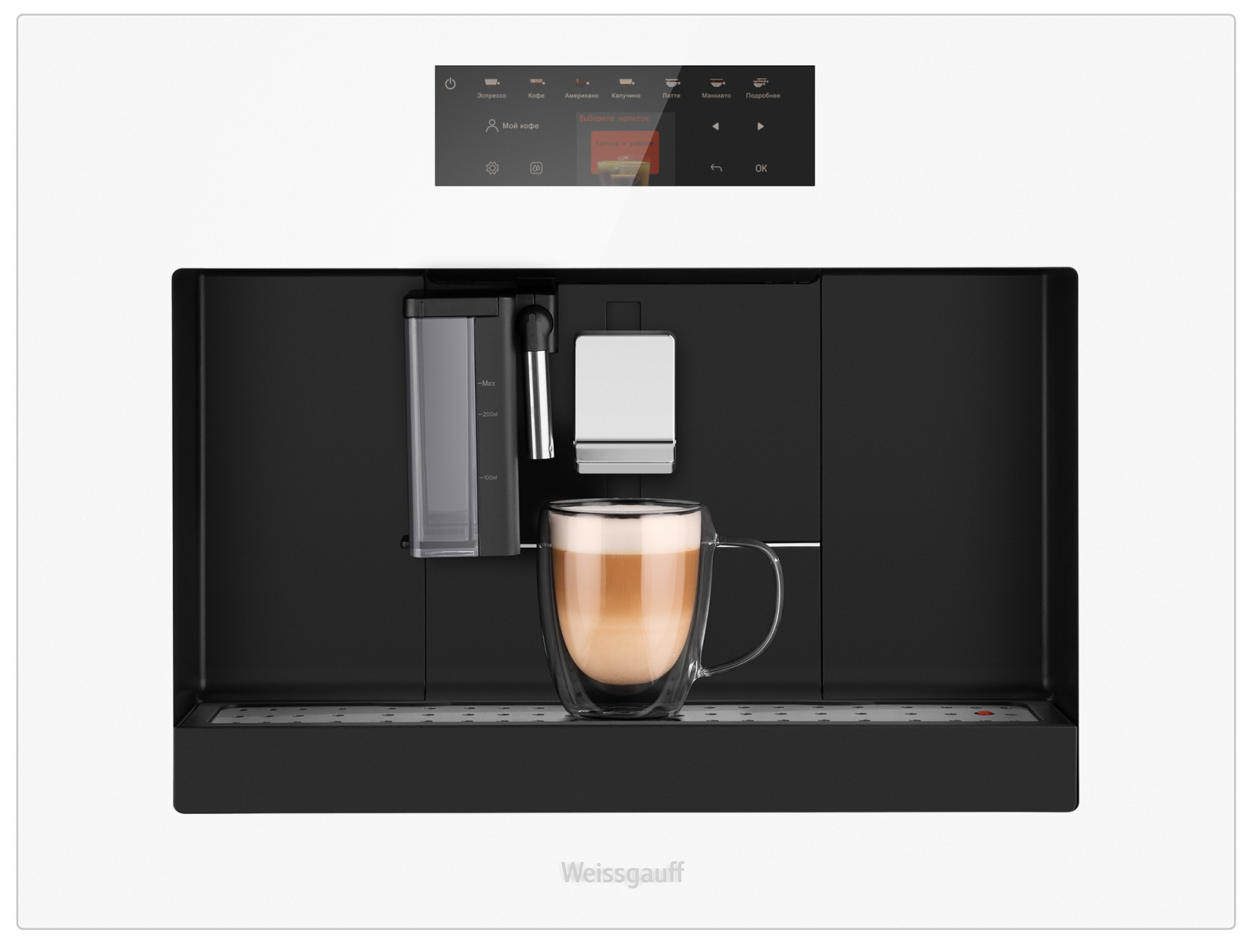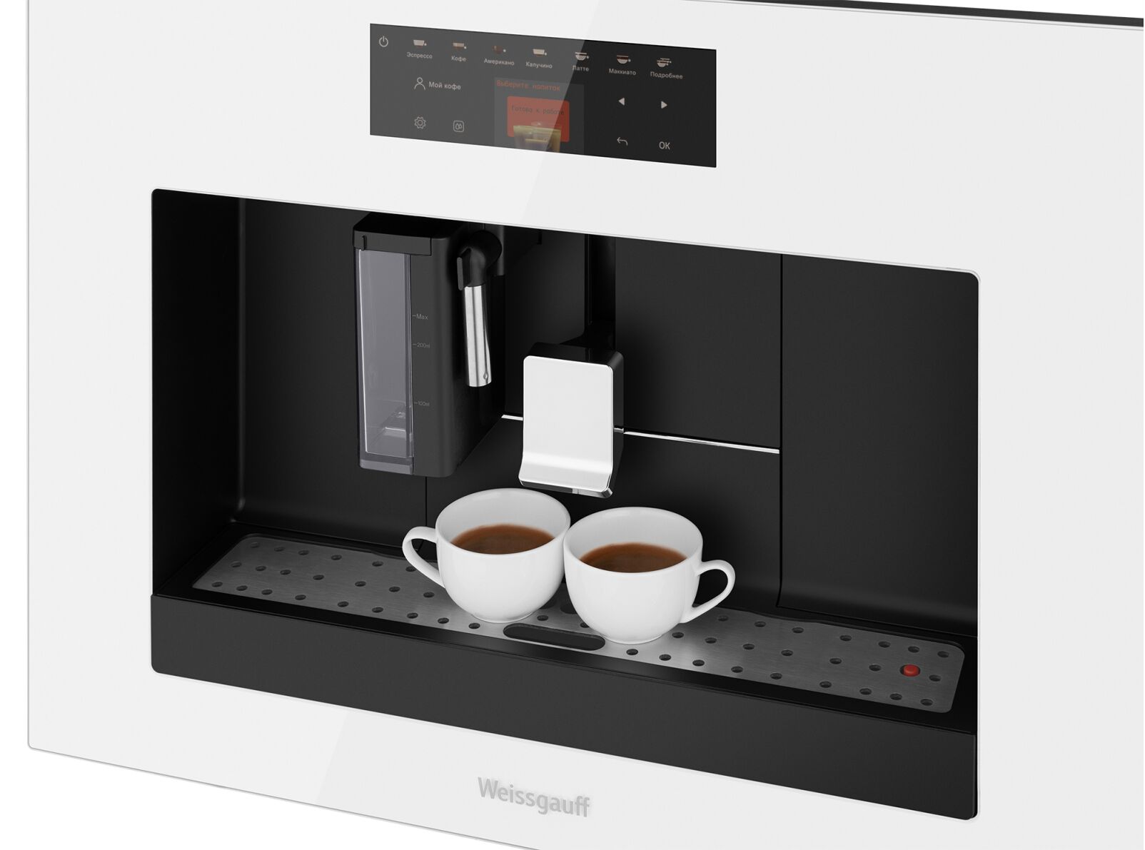 Встраиваемая кофемашина от Weissgauff, выполненная в белом цвете, оснащенная вместительным контейнером для зерен на 200 граммов и емкостью для молотого кофе на 10 порций, обладающая цветным сенсорным дисплеем, системой подачи молока с капучинатором, внешней емкостью для молока, а также 16 заранее предустановленными программами для приготовления ароматного вкуснейшего кофе и напитков прямо на вашей кухне!