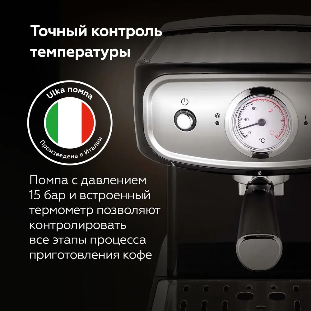 Сочетание в кофеварке мощности 850 Вт и итальянской помпы ULKA создающей давление в 15 Бар передадут весь аромат кофе.