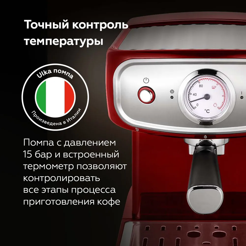 Сочетание в кофеварке мощности 850 Вт и итальянской помпы ULKA создающей давление в 15 Бар передадут весь аромат кофе.